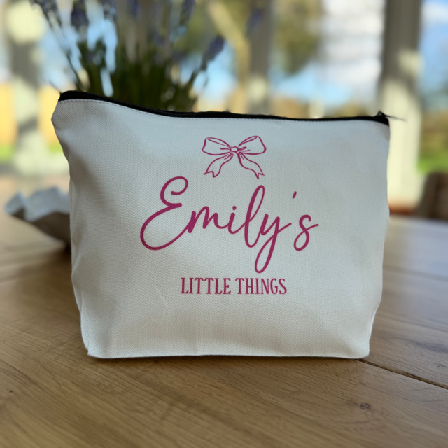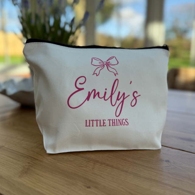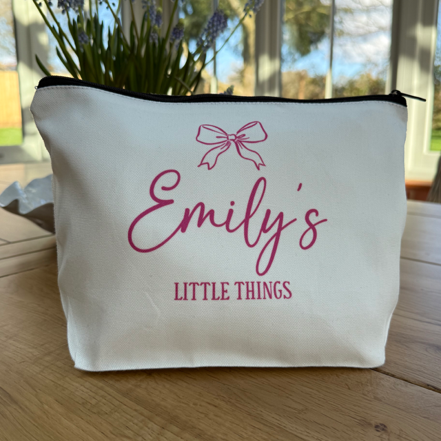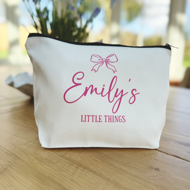 Our Personalised Bow Pouch is designed to keep life organised in the prettiest way. Featuring a delicate bow design and fully personalised text, this pouch makes a thoughtful and versatile gift for any occasion.