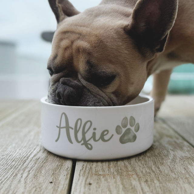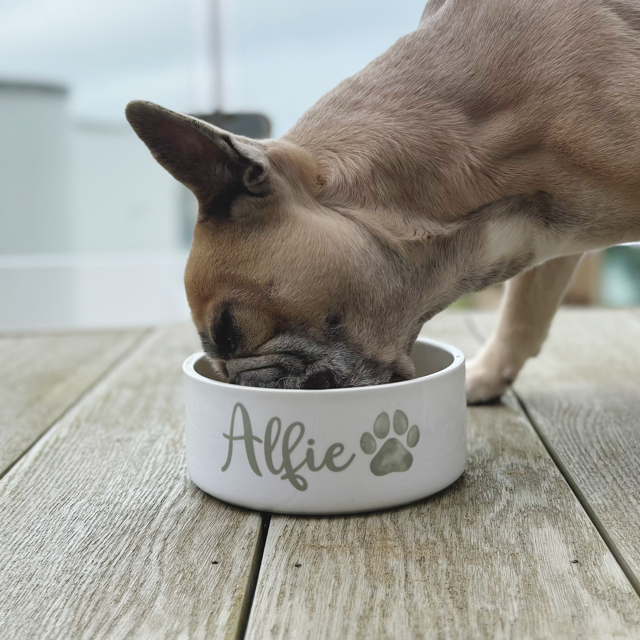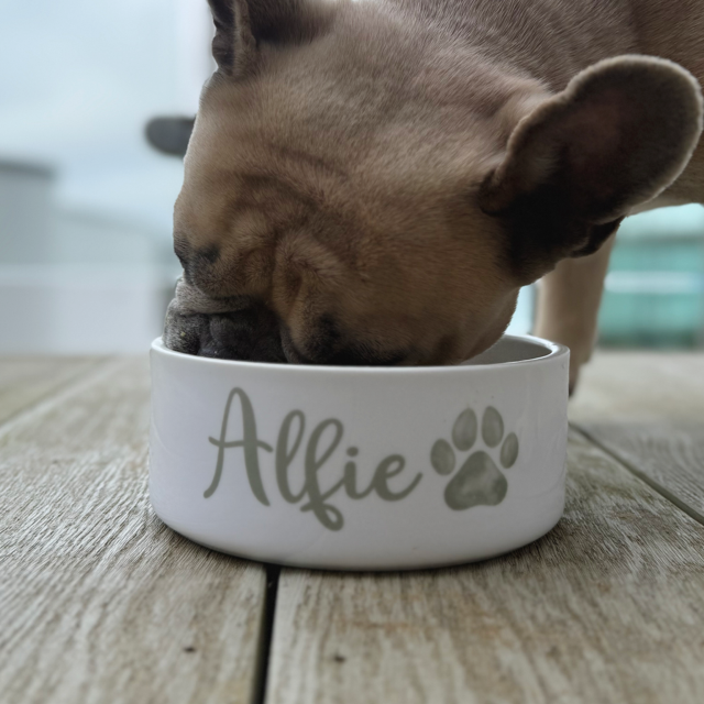 Each ceramic bowl is finished with your dog’s name (up to 18 spaces) and a paw print — with 32 paw colour options to choose from. The text colour will automatically match your chosen paw colour for a coordinated look.