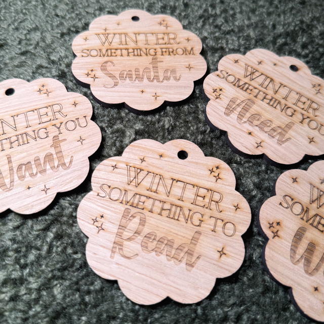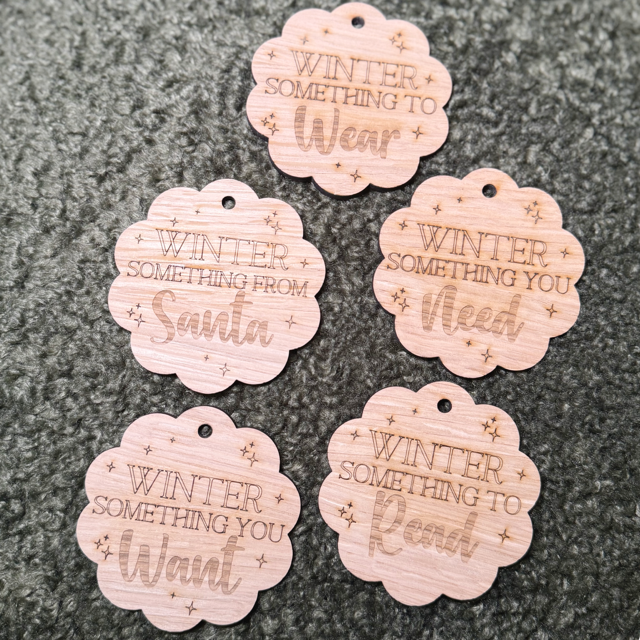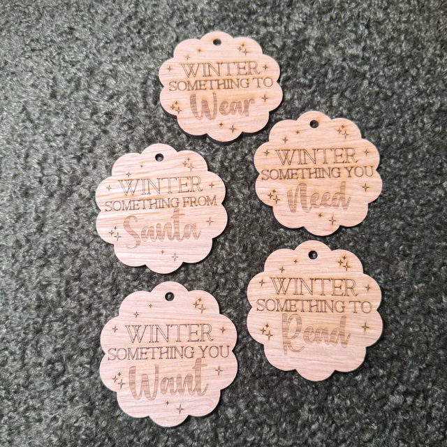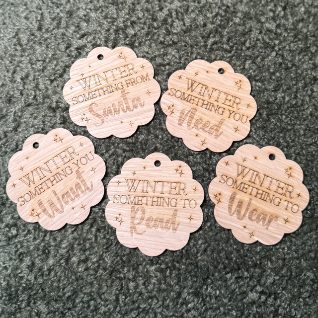 Create a magical gifting tradition with this Personalised Gift Tag Set for kids! Each wooden tag is engraved with a festive category and customised with your chosen name (Winter)(max 12 characters).
