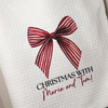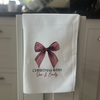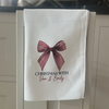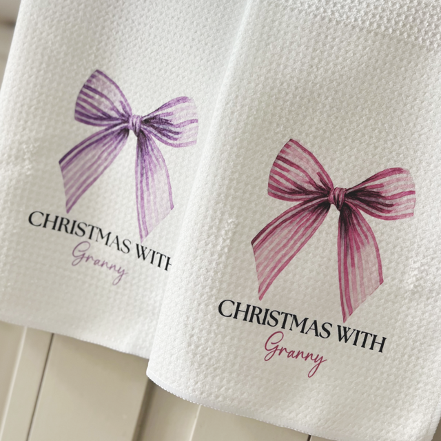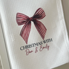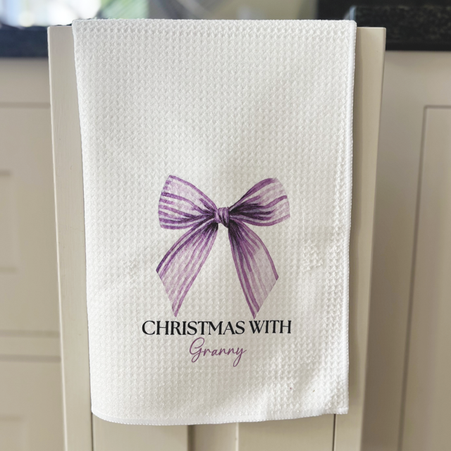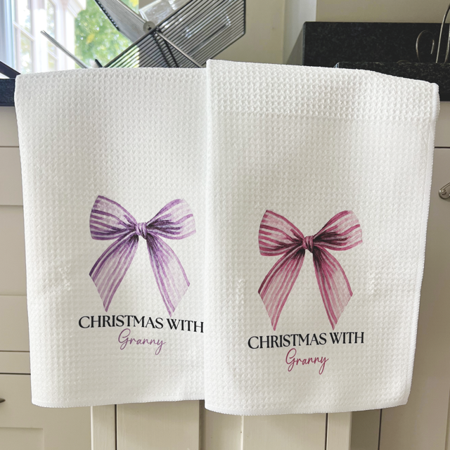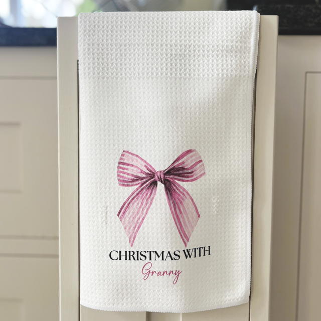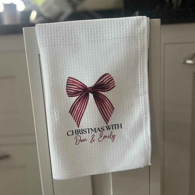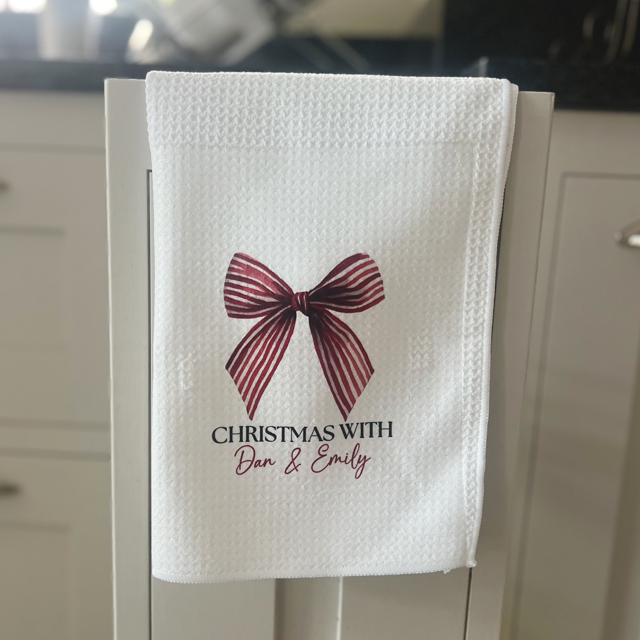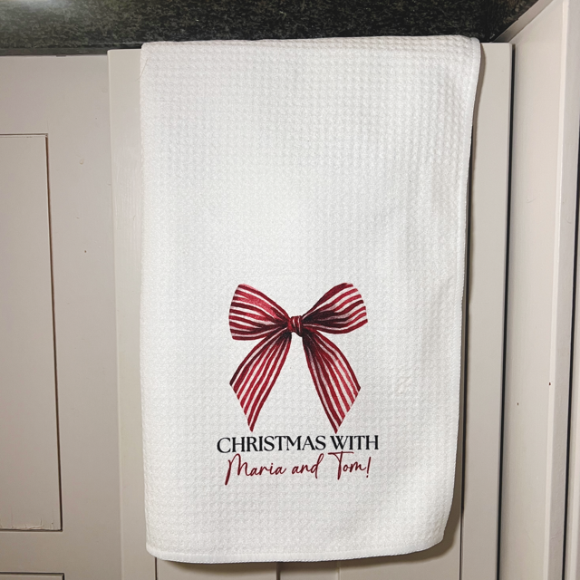Add a touch of festive charm to your kitchen with our personalised bow Christmas tea towel. Featuring the phrase “Christmas With” (standard) and your chosen name (up to 22 characters), this towel makes a thoughtful gift or a stylish addition to your holiday décor.