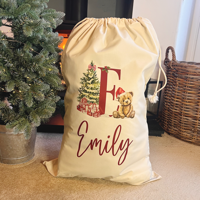 Add a personalized touch to your holiday gifts with our Christmas Teddy Sack! Featuring a cute teddy design and your chosen name, this sack is perfect for filling with presents. Order now and make your loved ones' Christmas extra special!