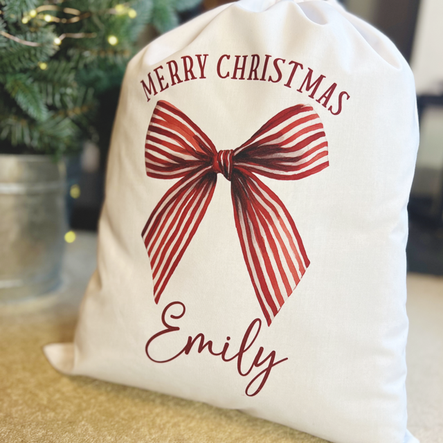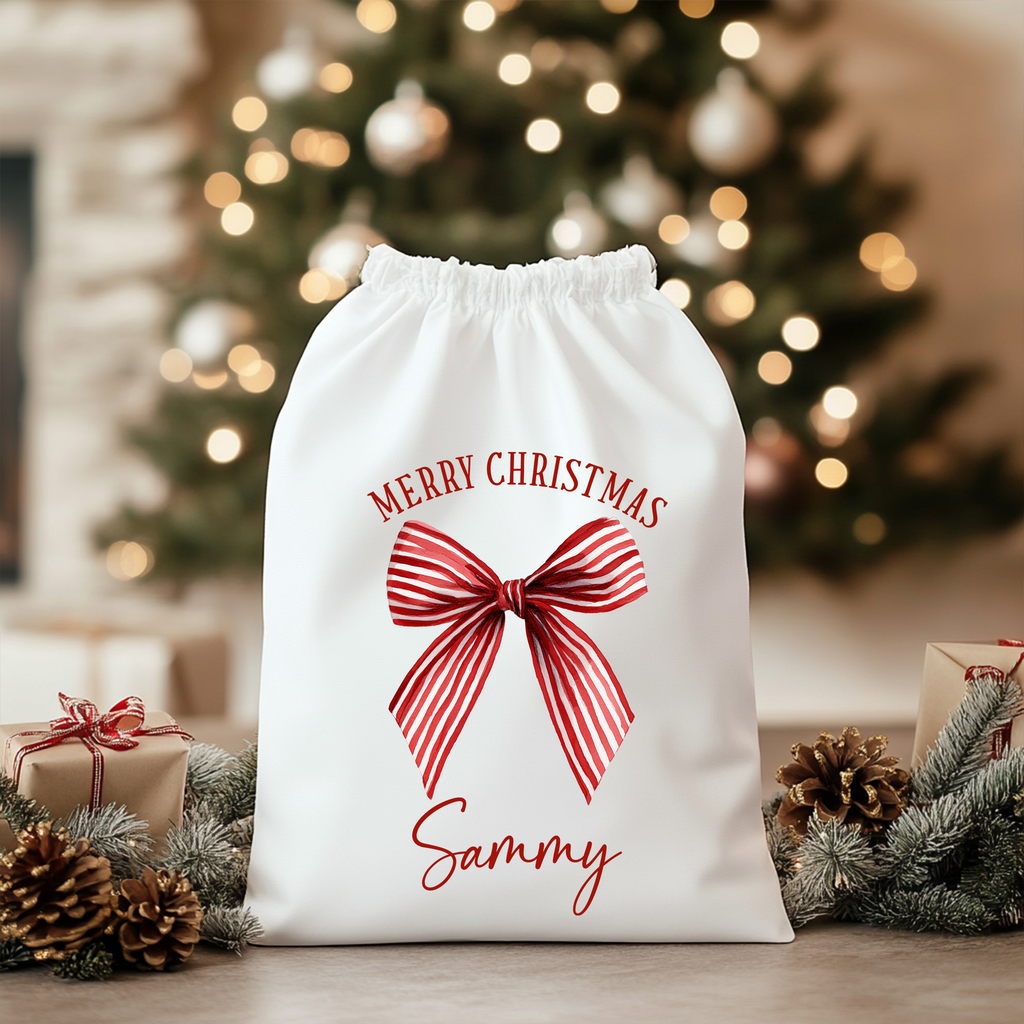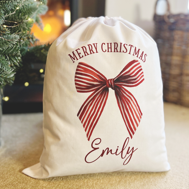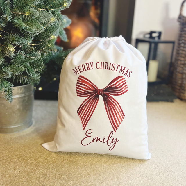 🎄 Wrap up Christmas in style with this beautiful personalised bow design gift sack. A festive alternative to wrapping paper, these reusable sacks add a special touch to Christmas morning.