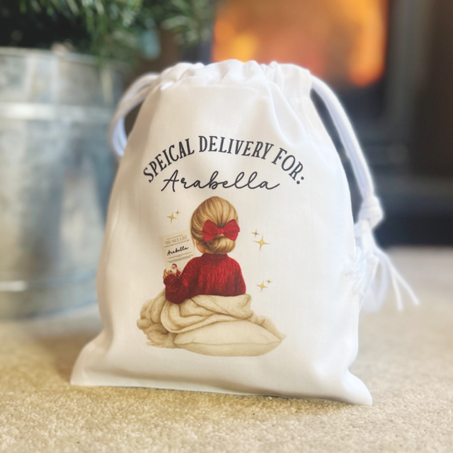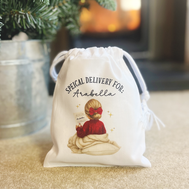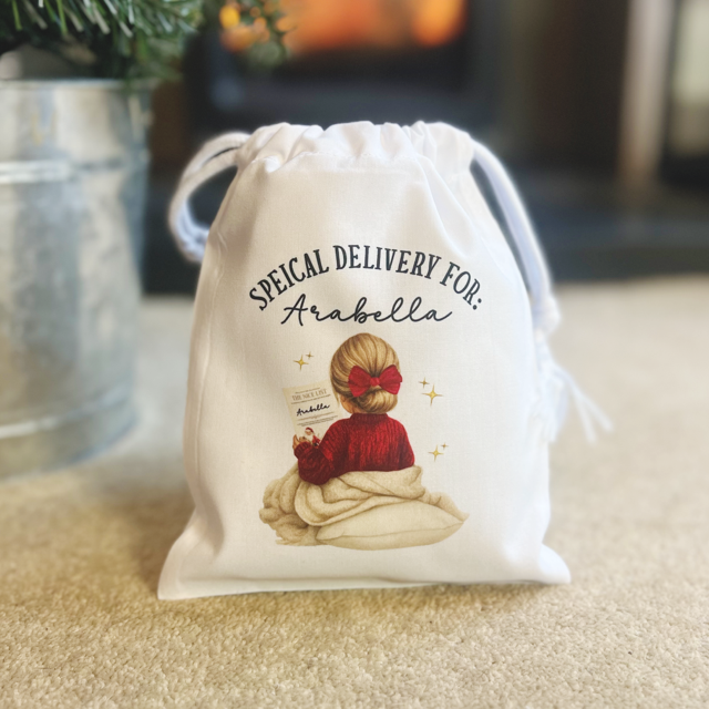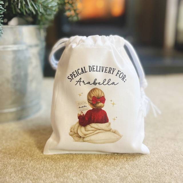Each pouch features a cosy Christmas girl design with a soft blanket and a “Special Delivery For:” message — personalised with your chosen name.