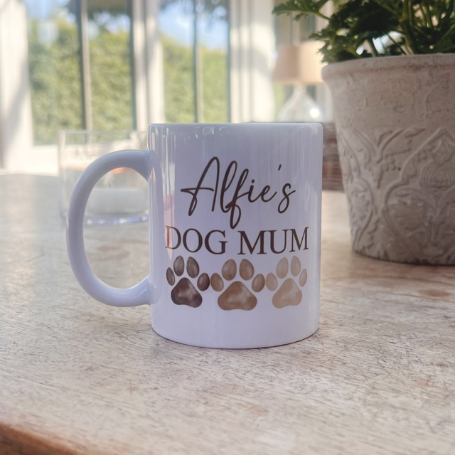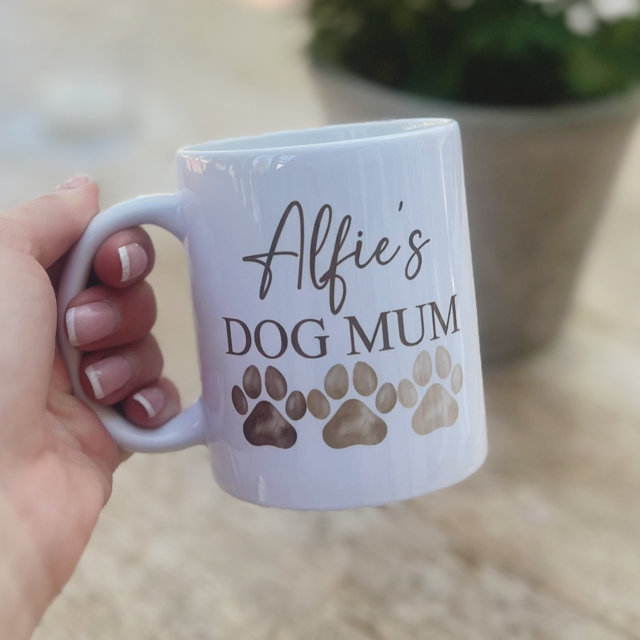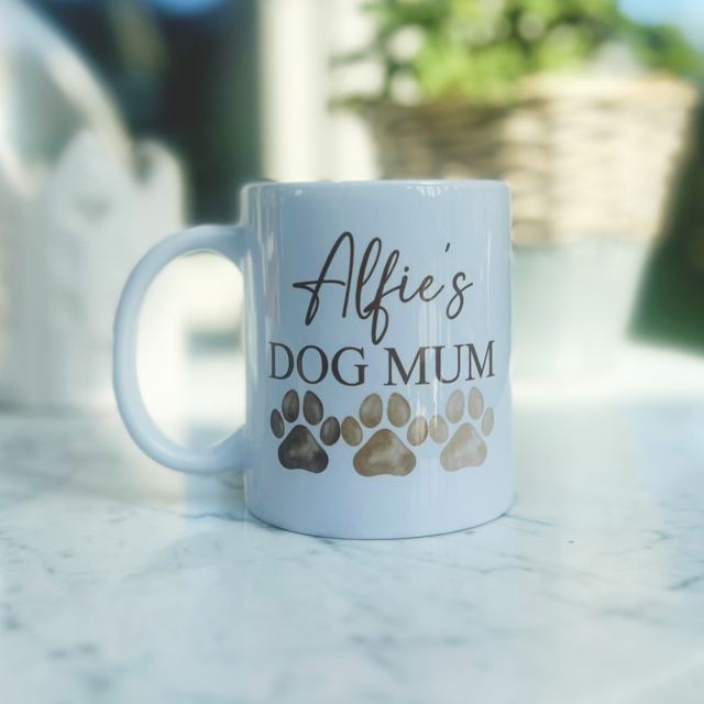 PERSONALISED INFO: MAX 18 Spaces (Alfie's) DOG MUM is standard, All mugs are made to order as may differ slightly, This includes text size.