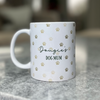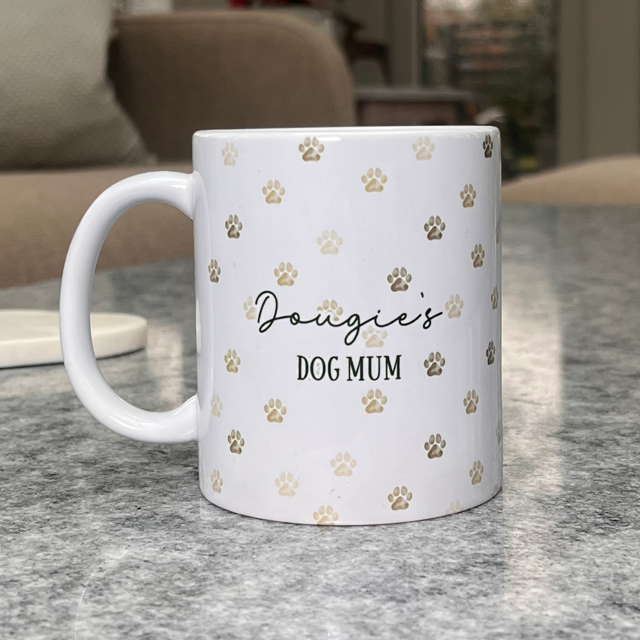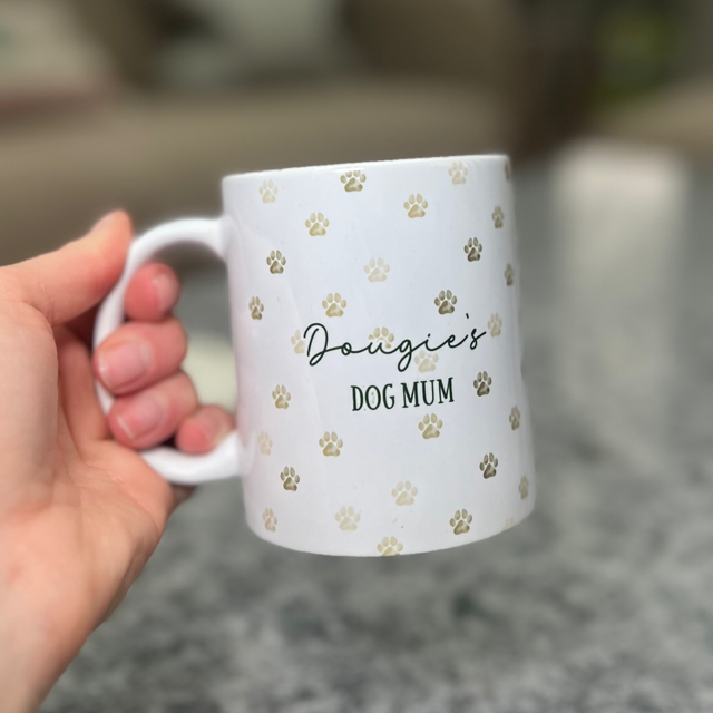 A thoughtful gift for every proud Dog Mum! This sweet paw-print mug features a custom name above the standard text “Dog Mum”. A lovely treat from her favourite pup — perfect for birthdays, Mother’s Day, Christmas or just because.