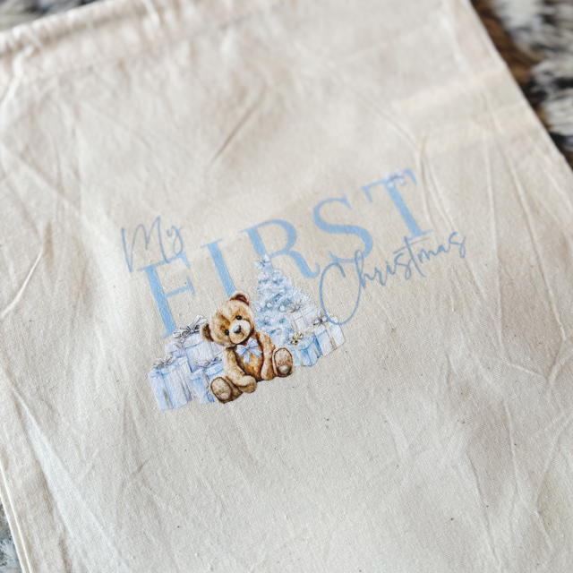 Celebrate a baby's first Christmas with this precious blue teddy in a natural small sack. Soft, cuddly, and wonderfully gentle, it's the perfect keepsake for milestone moments and cherished memories. Ideal as a gift for newborns or young children, this delightful plush toy combines comfort with festive charm.