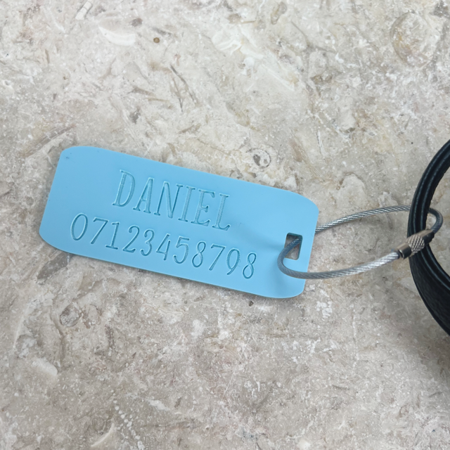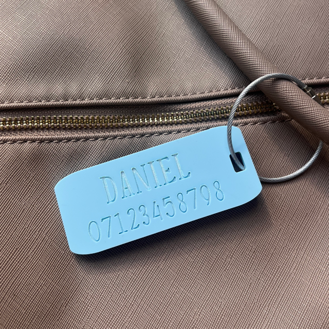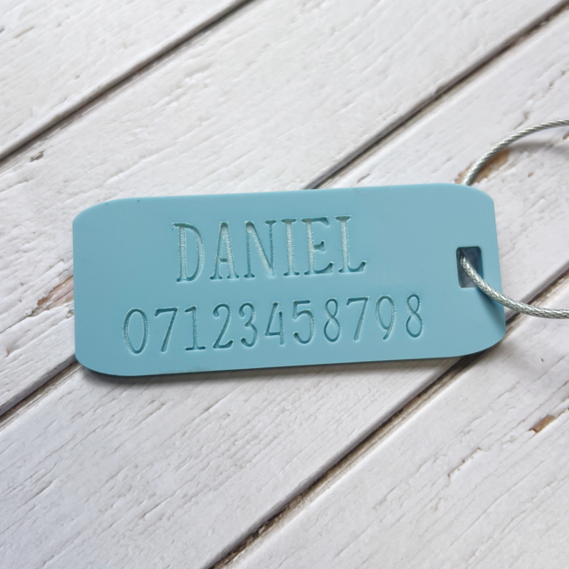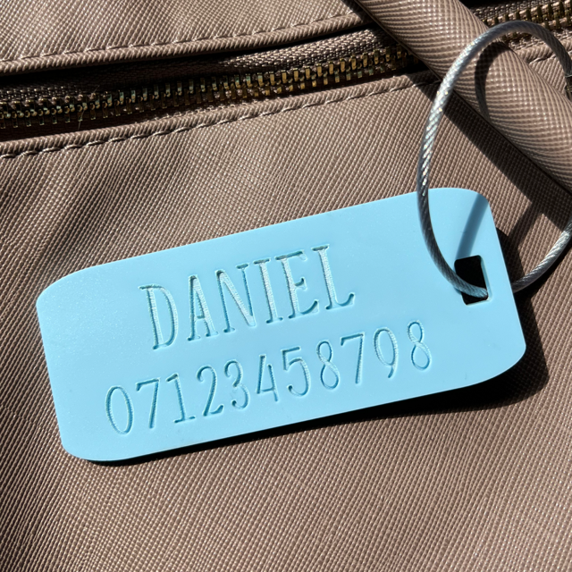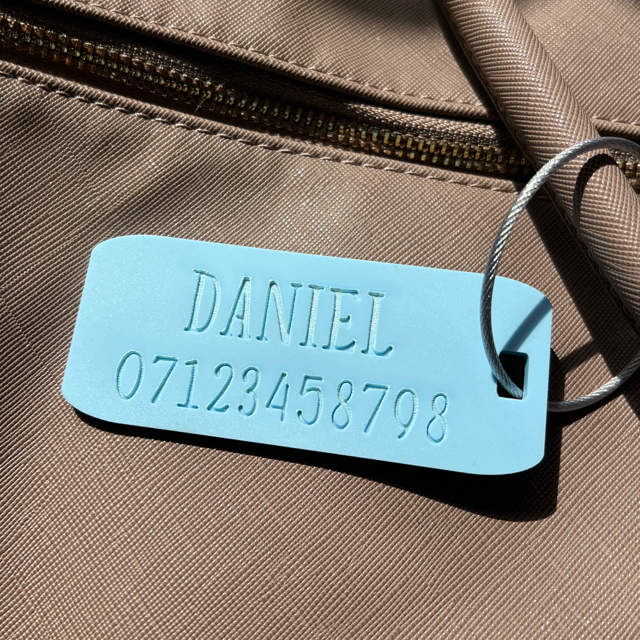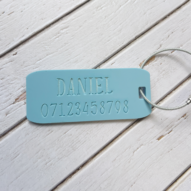 Keep your bags safe and stylish with our personalised acrylic luggage tags. Each tag is engraved with your details (up to 22 characters per line, two lines max) – ideal for adding a name, phone number, or contact info.