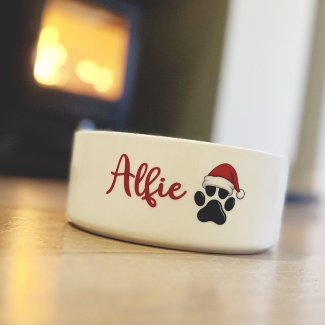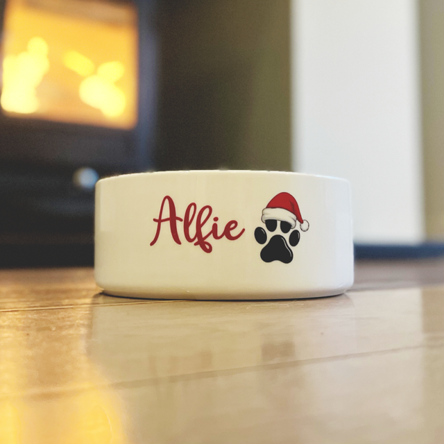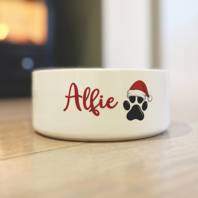A festive favourite for your furry friend! Our Christmas Dog Bowl features a cute Santa hat paw and your pet’s name in red script for that perfect seasonal touch.