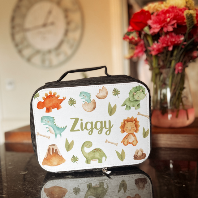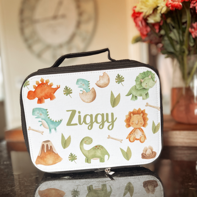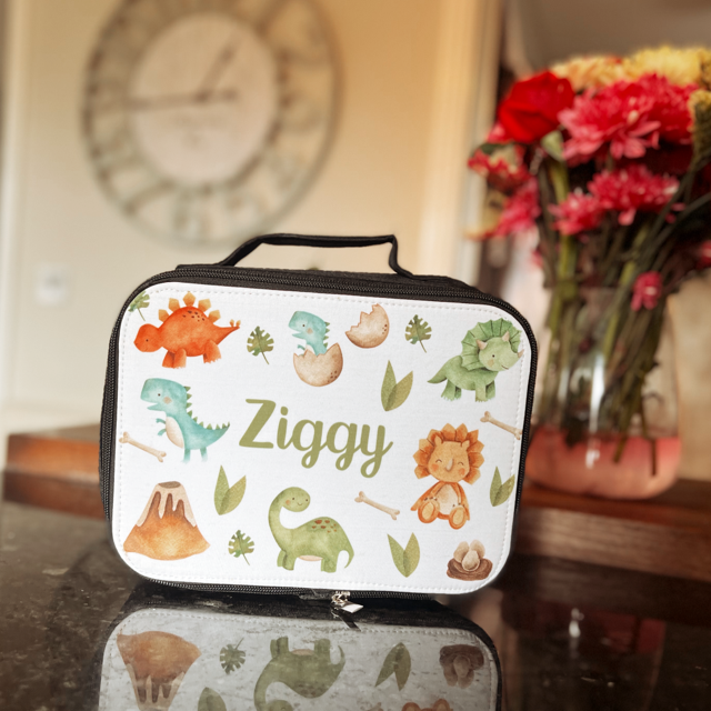Dress up your little one's lunchtime with this adorable dinosaur custom lunch bag! Fun and functional, the sturdy bag will keep your child's lunch together, and make them the envy of everyone in the cafeteria. The perfect way to show off their unique style!