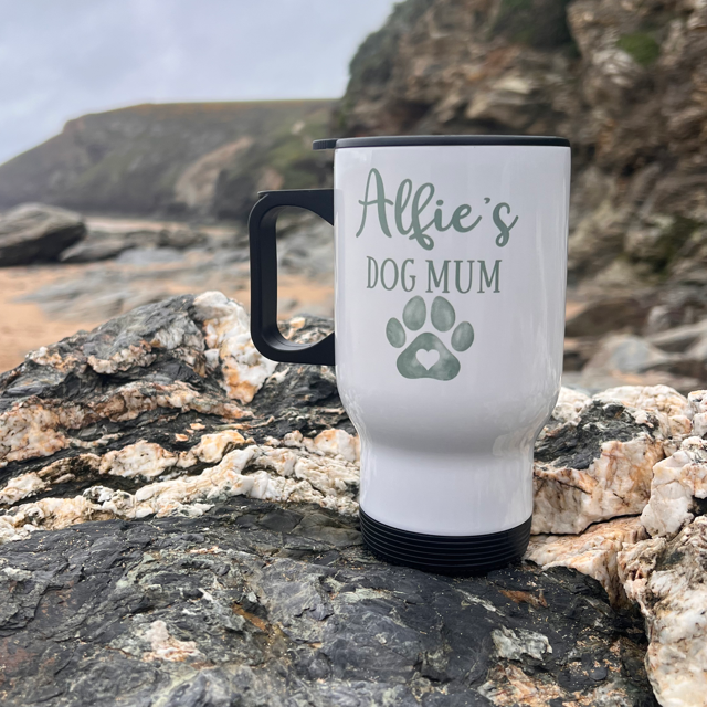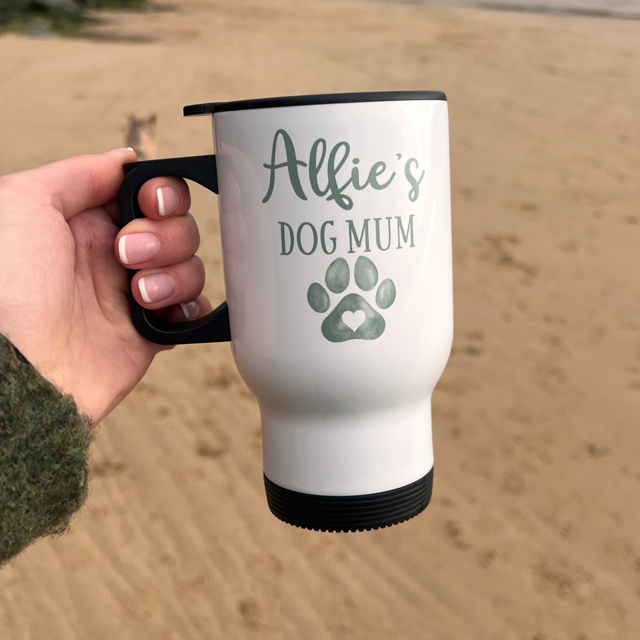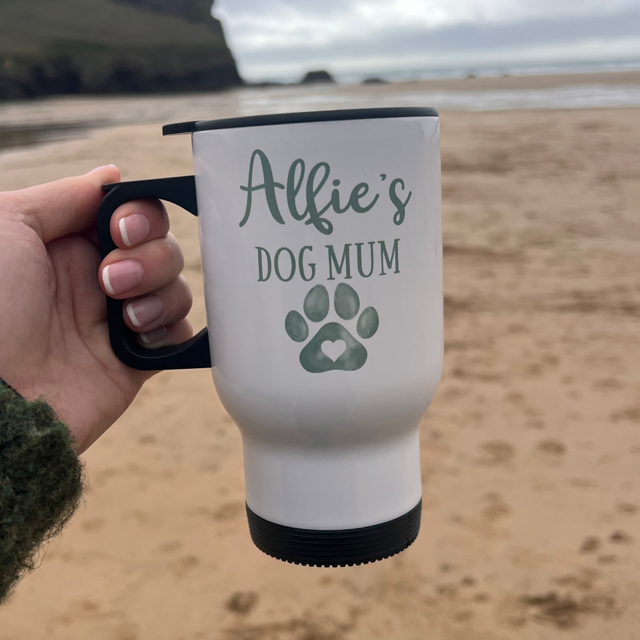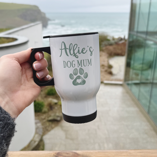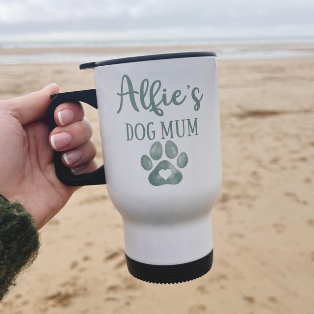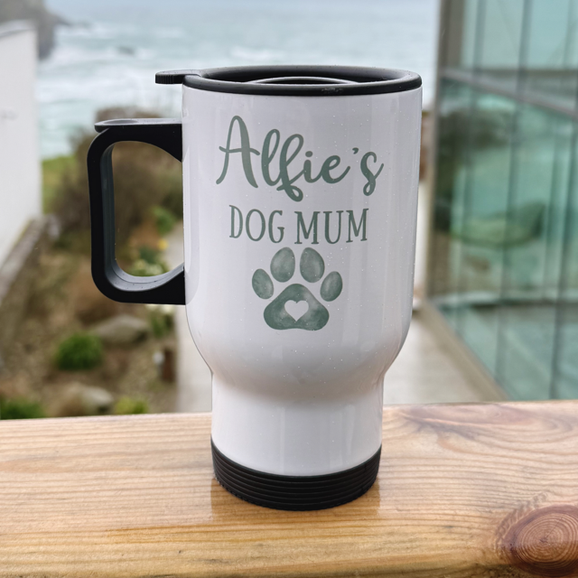 Our Personalised Dog Mum Travel Mug is the perfect everyday essential for busy dog mums. Featuring a paw design and your dog’s name, this mug is both practical and meaningful – ideal for coffee on the go.
