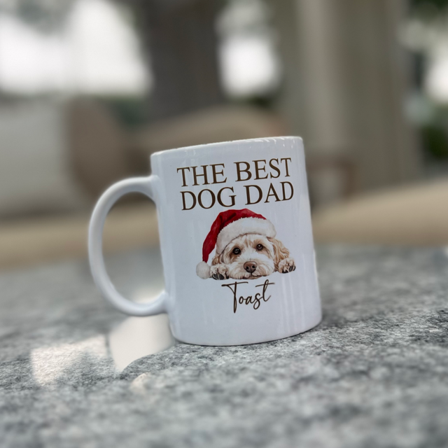 Each ceramic mug features the wording “The Best Dog Dad” with a cute festive dog illustration (choose from 217 dog breeds) and can be personalised with your dog’s name (up to 18 characters).