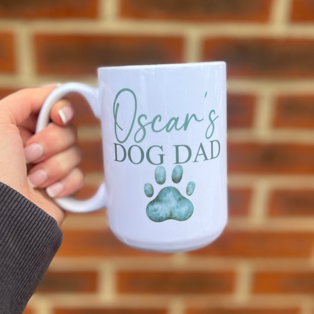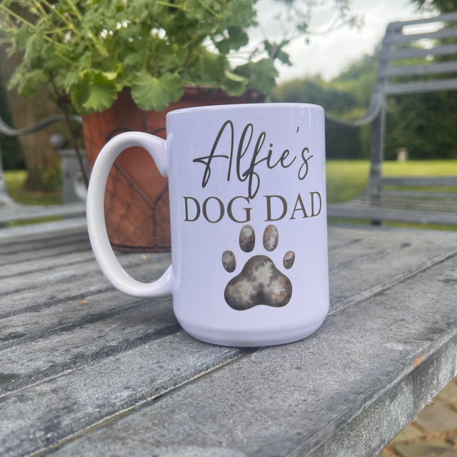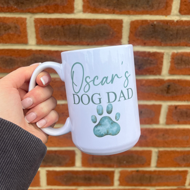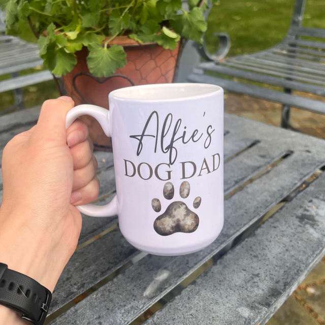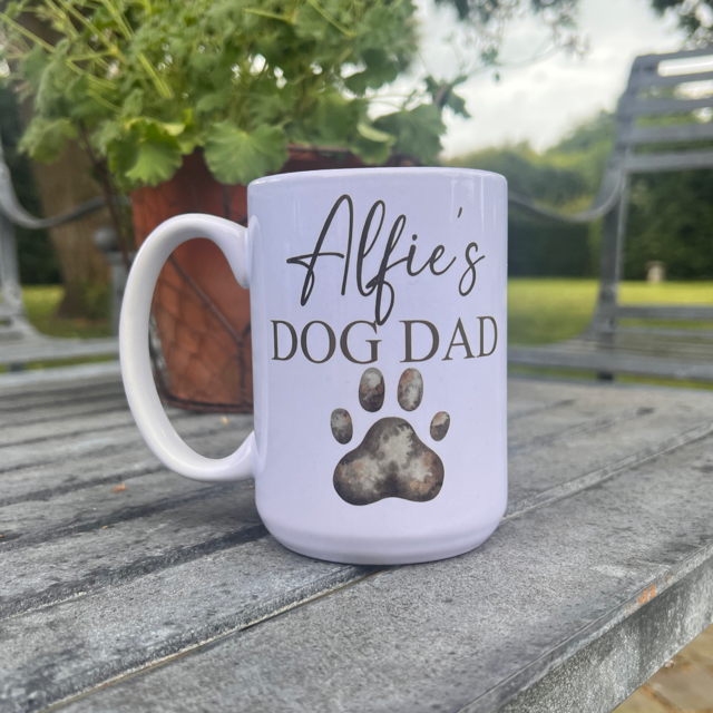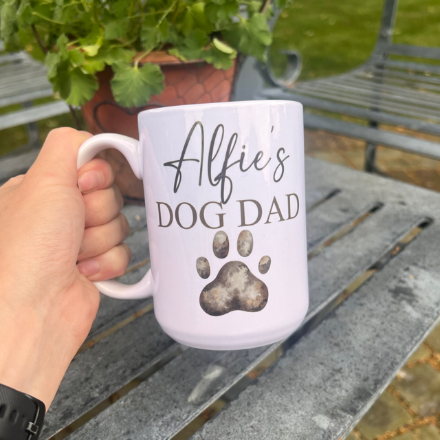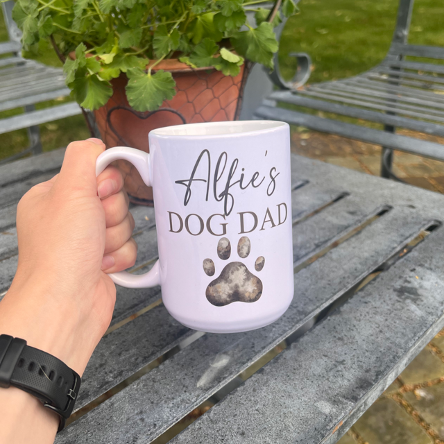 Celebrate the special bond between a dog dad and their furry companion with our personalised mug. Made of high-quality ceramic, this one-of-a-kind mug can be customized with the dog dad's name and a pawprint design. Perfect for sipping coffee or tea with your beloved pup by your side.