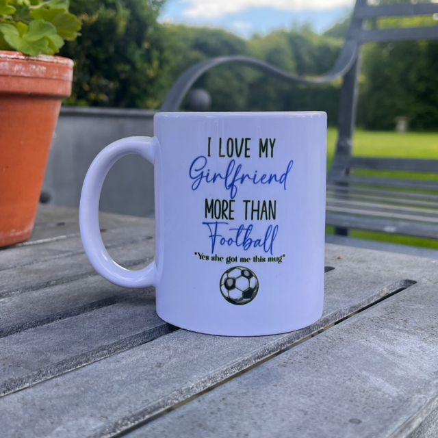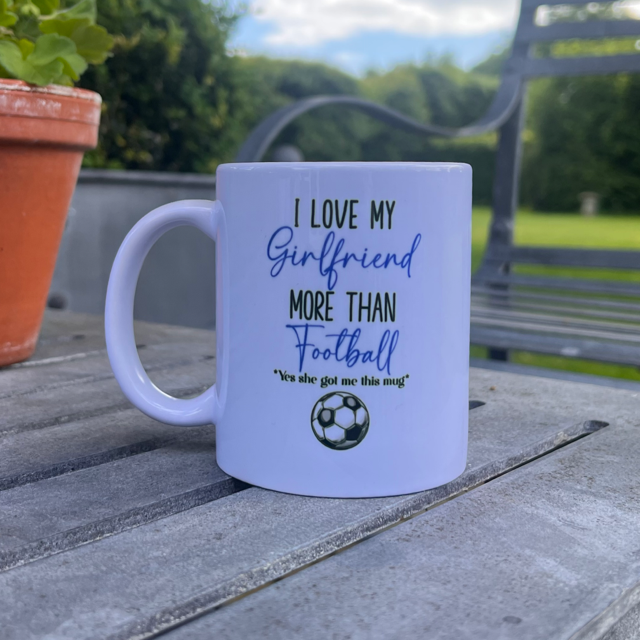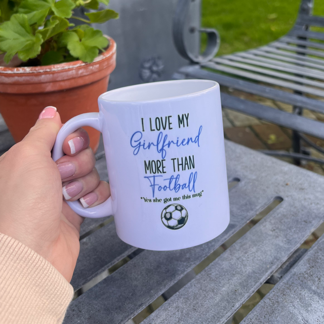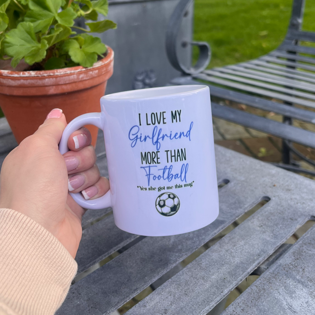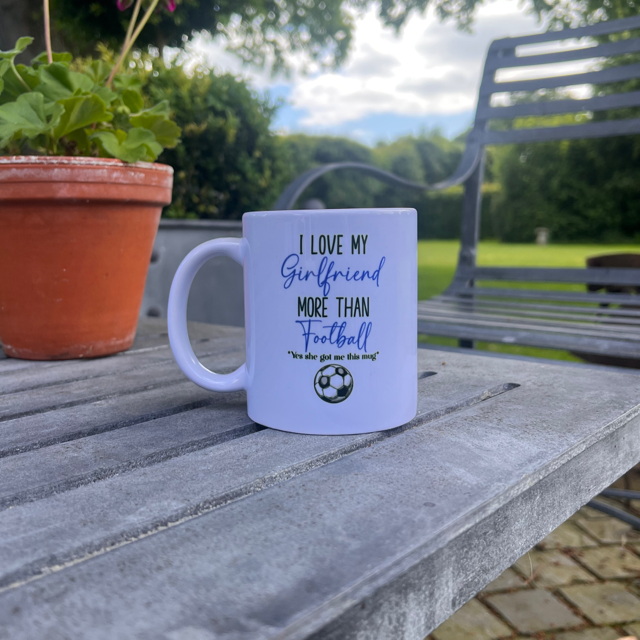 Show your girlfriend some love with our "I Love My Girlfriend More Than Football" mug! Perfect for football fanatics who have found their true love, this mug combines your passion for the game with your love for your significant other. Enjoy your favourite sport while showing your girlfriend how much she means to you.