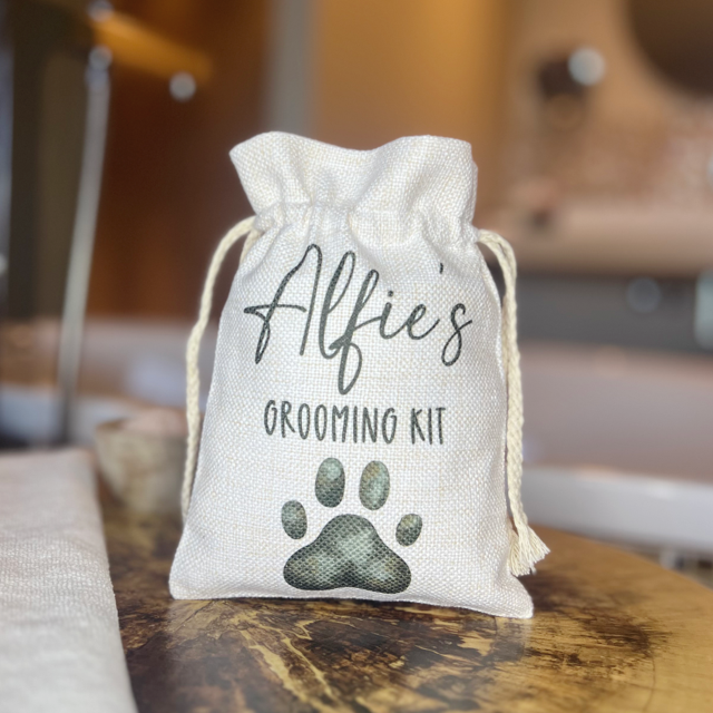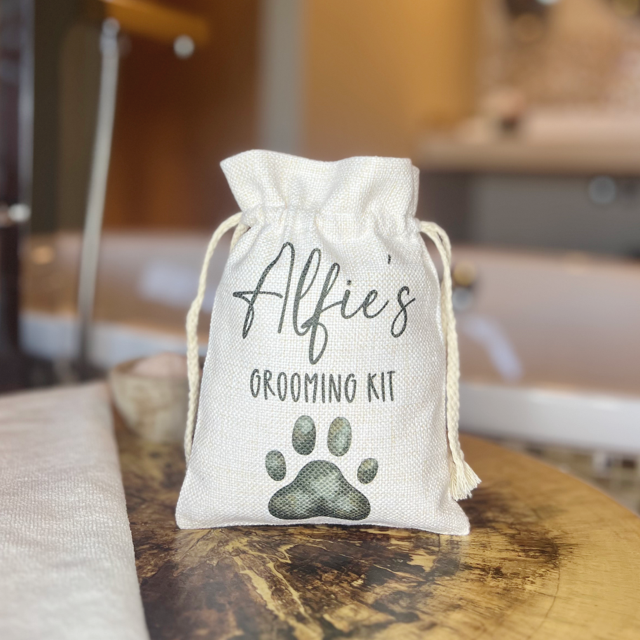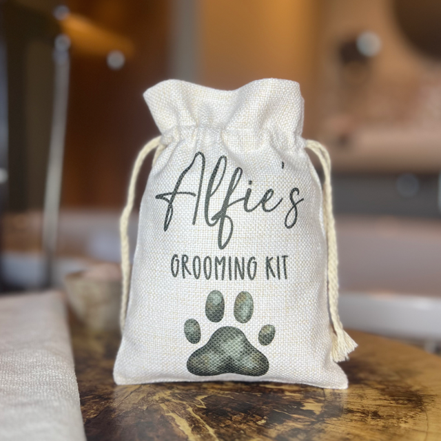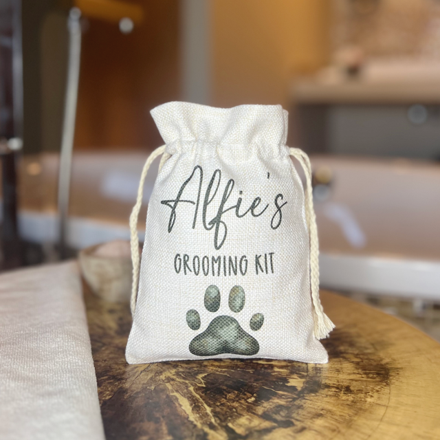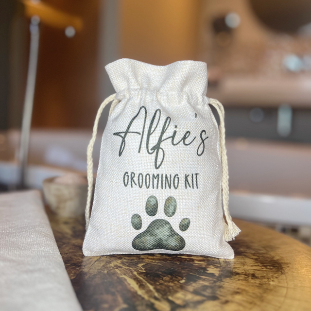 PERSONALISED INFO: GROOMING KIT is standard and can not be changed. Its just the name you are able to change. Please leave this as you would like it printed onto your order. MAX 18 Spaces. Paw colour on pouch is two. Text will change with paw colour.