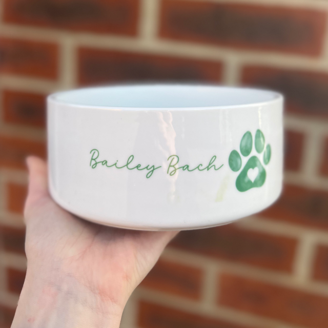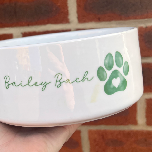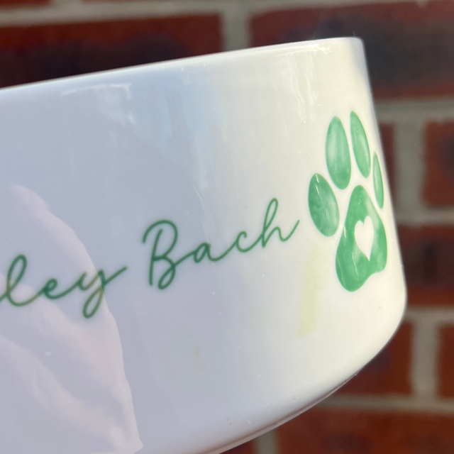 Bowl is printed with name Bailey Bach as per photos. As you can see the there is printing marks on the bowl