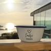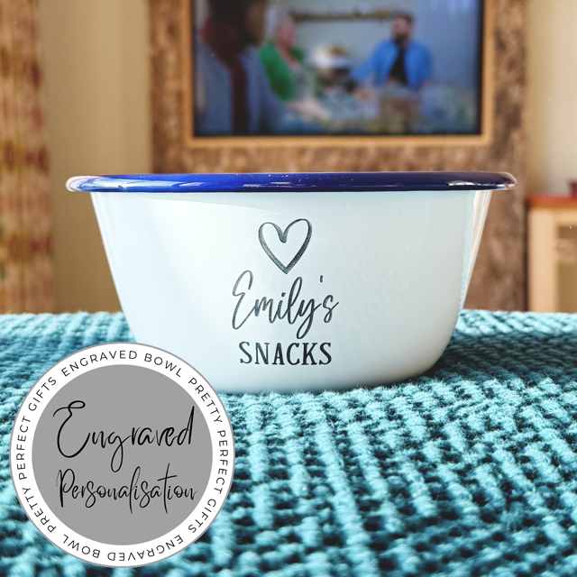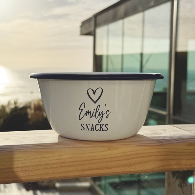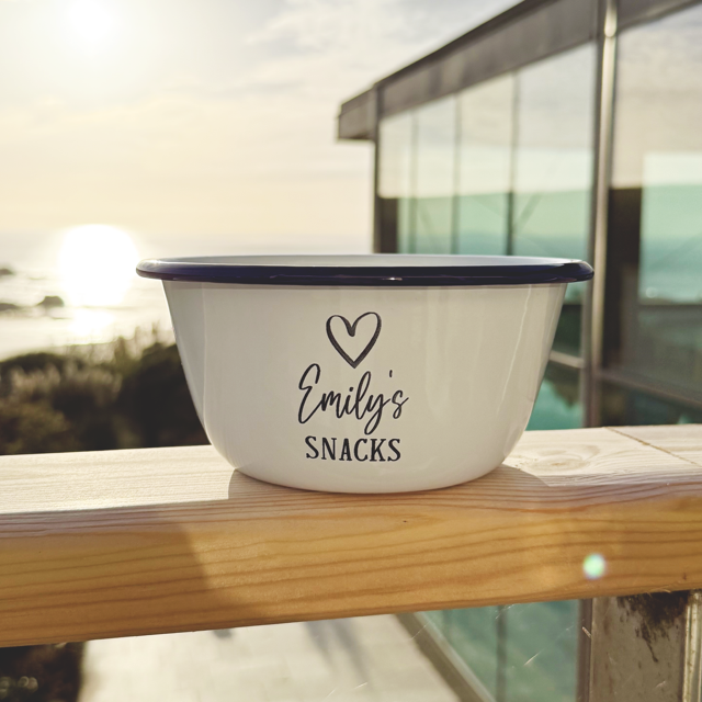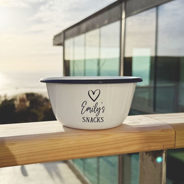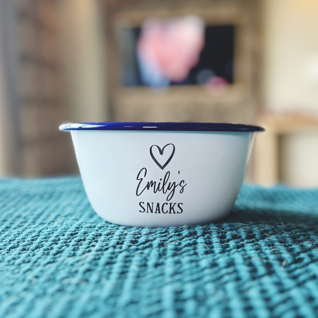 Our snack bowls are perfect for cosy nights in, movie treats, or adding a little fun to your kitchen! Each enamel bowl features a heart design, the word SNACKS at the bottom, and your chosen name in the centre.