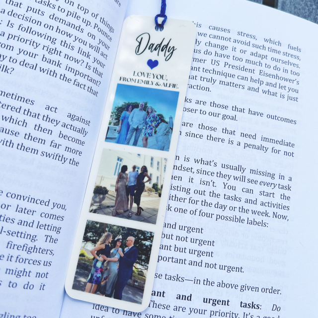 Personalised Info: Top line - (Daddy) Max 18 Spaces, Middle Line - (LOVE YOU,) Max 18 Spaces, Bottom Line - (FROM EMILY & ALFIE.) Max 20 spaces. Please leave the text as you would like it to appear on the item. ***Please be aware that images may be slightly cropped to fit onto the bookmark. The photos will be in a order will be random***.