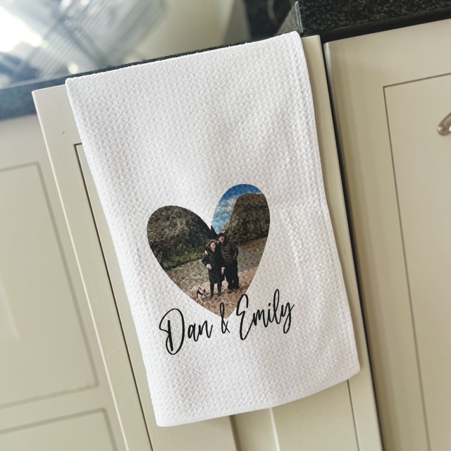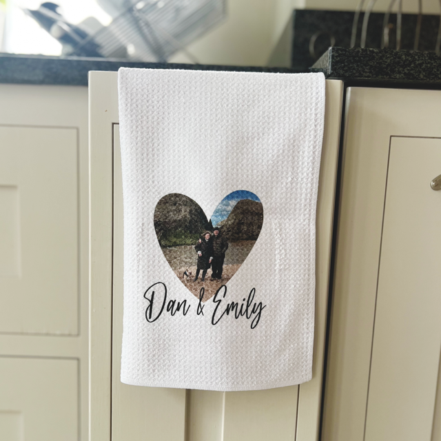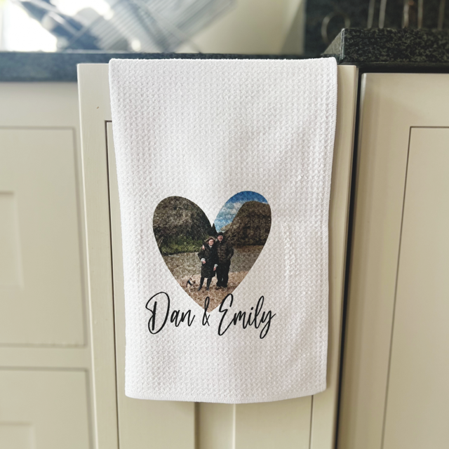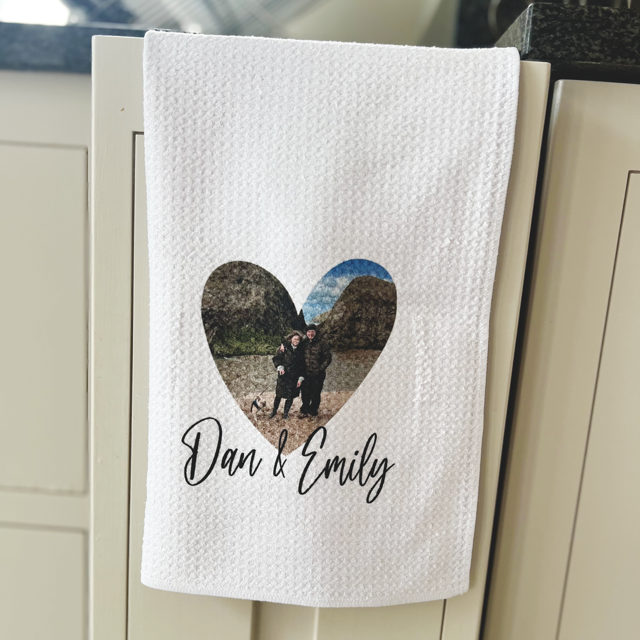 Show your love and add a personal touch to your kitchen with our Heart Photo Personalised Tea Towel! Upload a special photo and create a unique and practical gift or keepsake. Perfect for any occasion!
