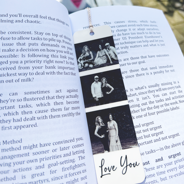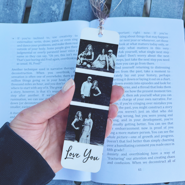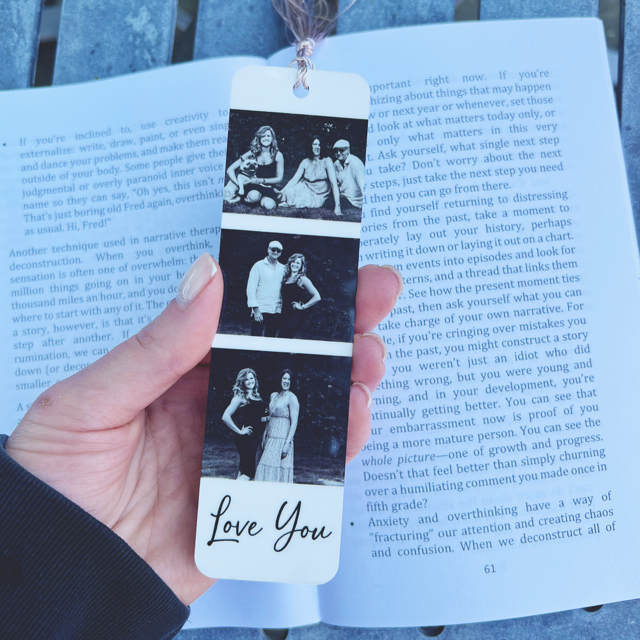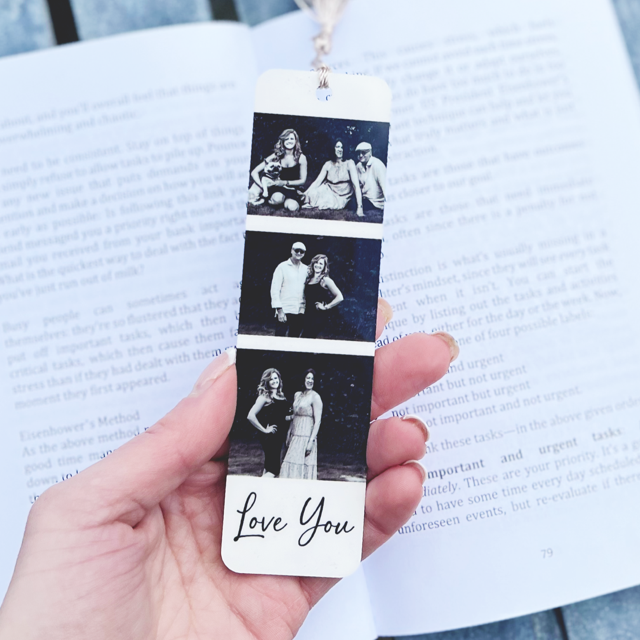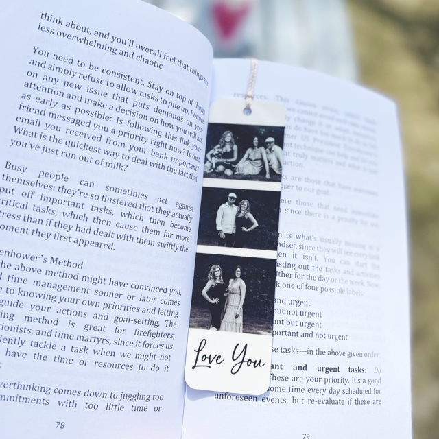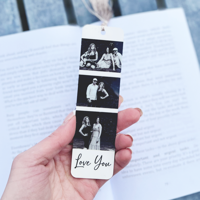 PERSONALISED INFO: MAX 18 Spaces for the text line (Love You) ***Please be aware that images may be slightly cropped to fit onto the bookmark. The photos will be in a order will be random***.