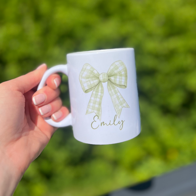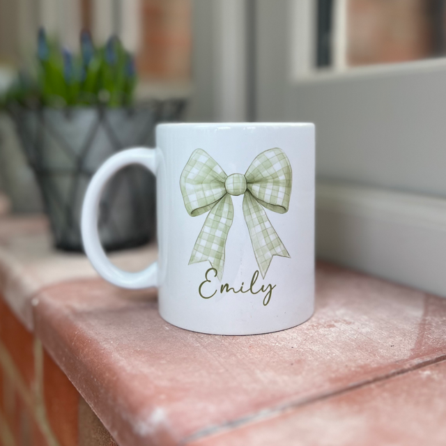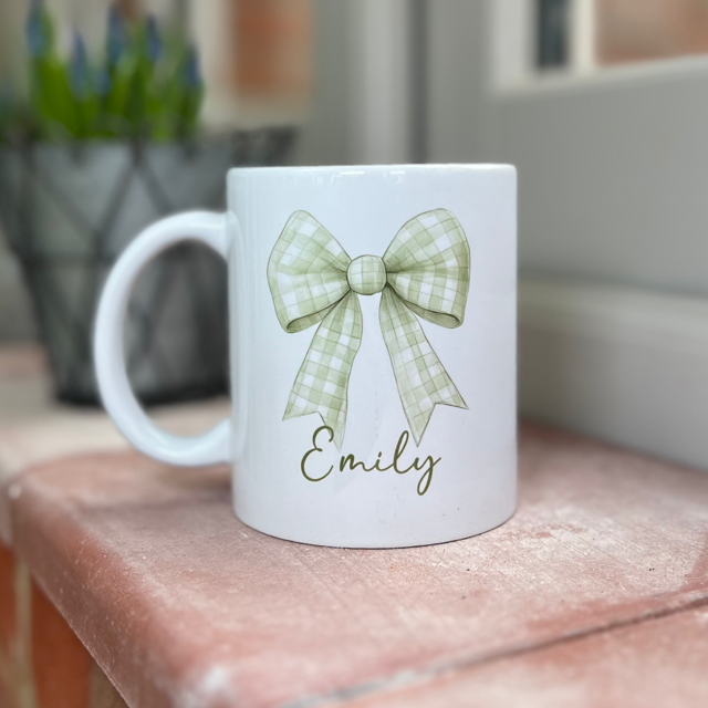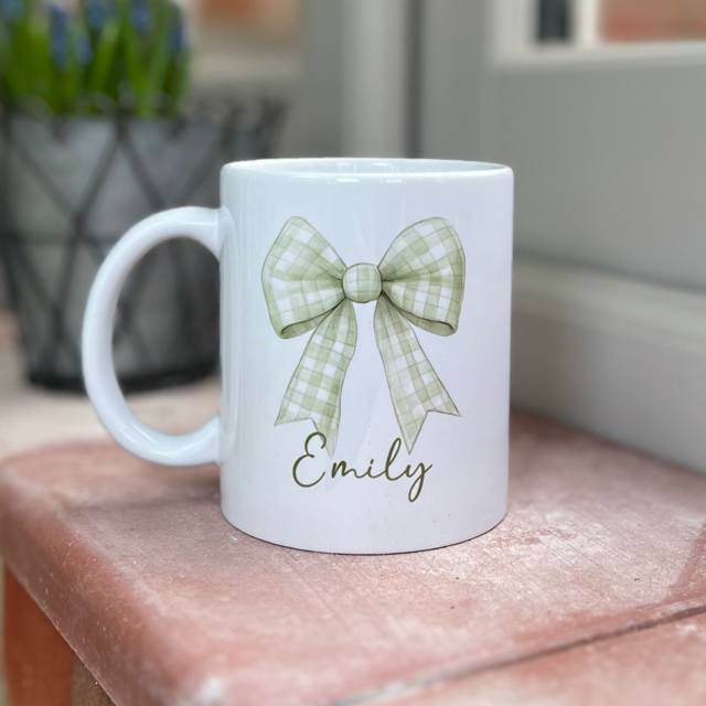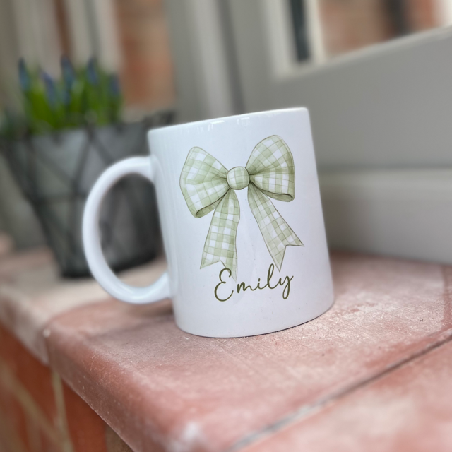 Introducing the elegant Bow Personalised Mugs! These mugs feature a delicate bow design that can be personalized with initials, names, or a special message. Perfect for adding a touch of charm to your morning coffee routine or as a thoughtful gift for loved ones. Order yours today!