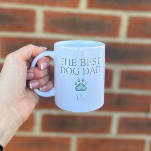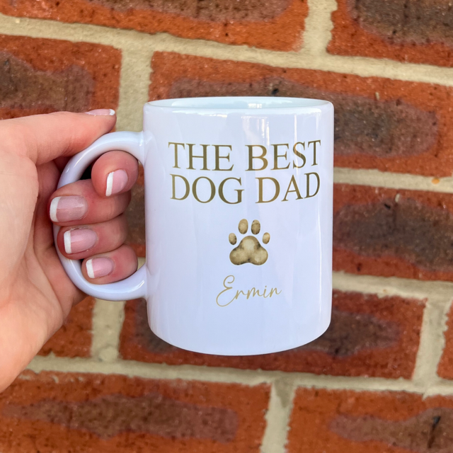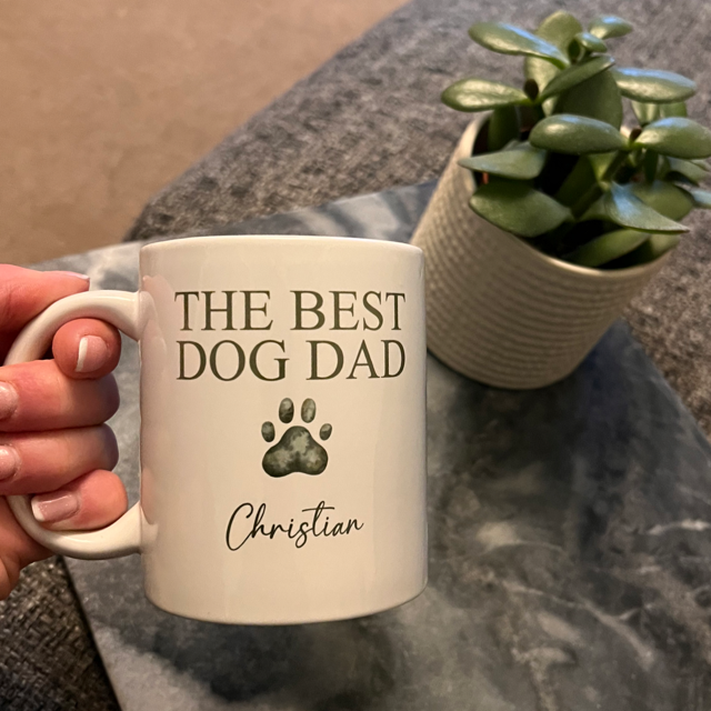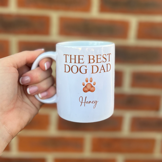 Surprise your favourite dog dad with this unique and personal mug. Featuring paw prints and a custom 'Best Dog Dad' message, this mug is sure to brighten his day with a smile! Show your appreciation and let him know how much he is loved!