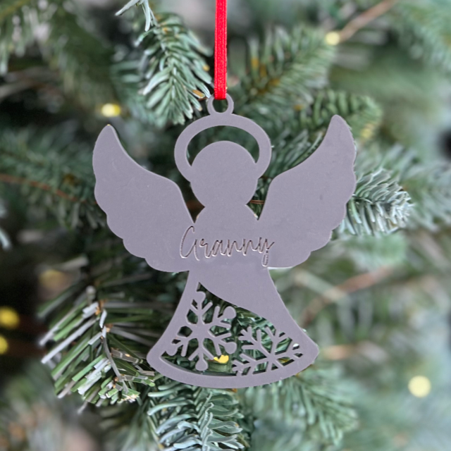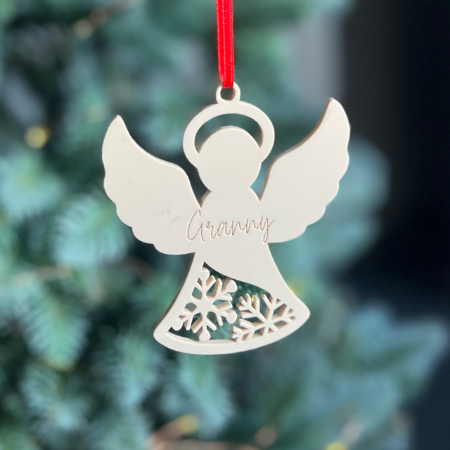 This elegant acrylic angel features delicate cut-out snowflake detailing, finished with a festive red ribbon ready to hang.