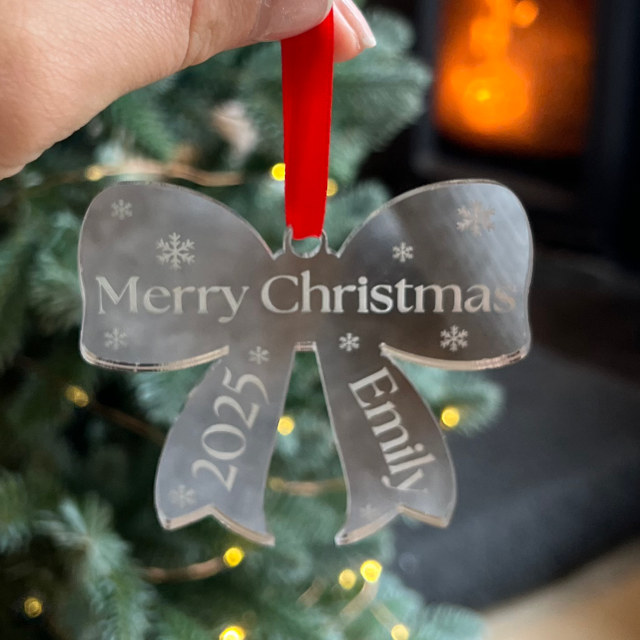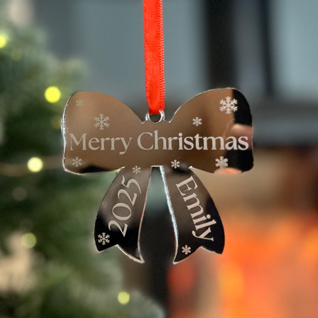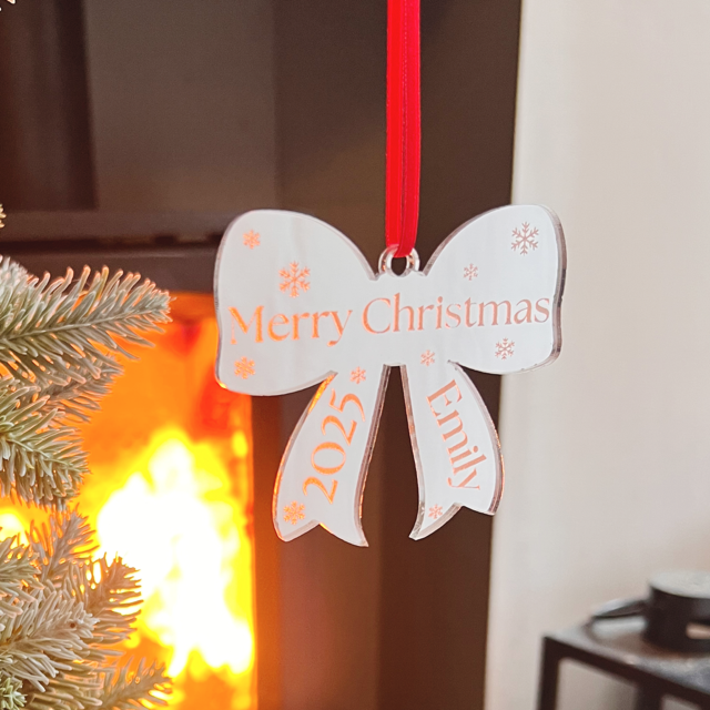 Christmas Bow Ornament with Name – Custom Mirror Acrylic Decoration