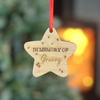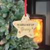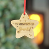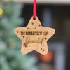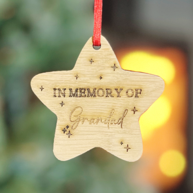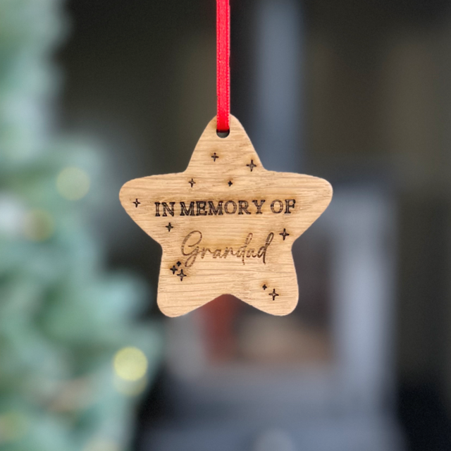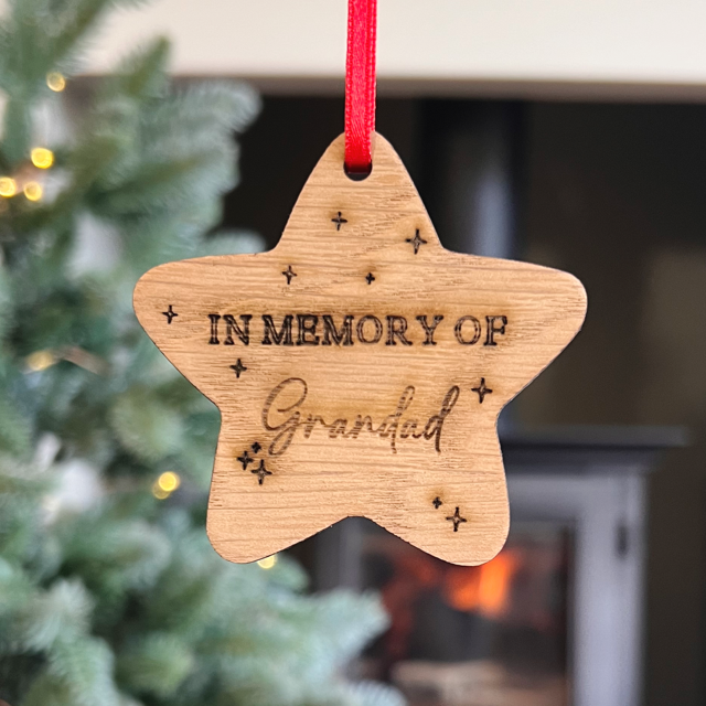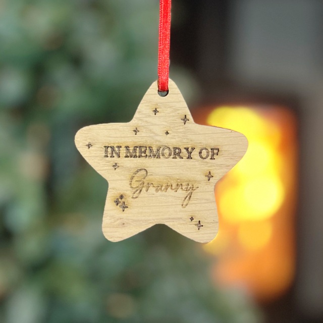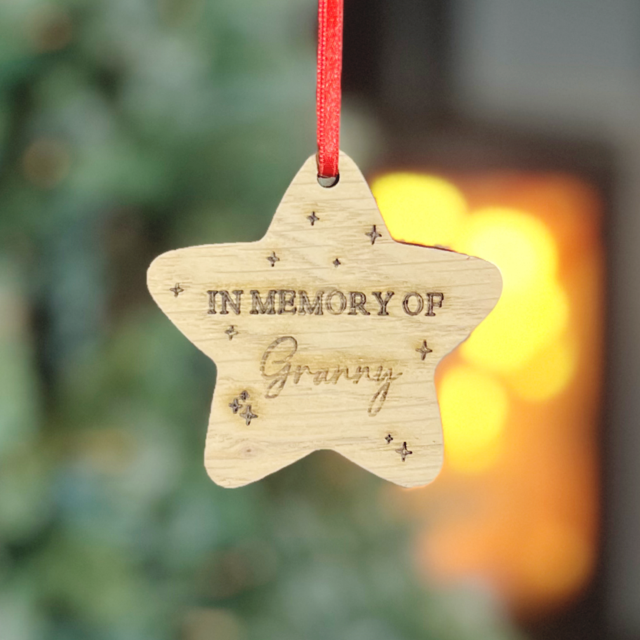 This small wooden star decoration is engraved with In Memory Of and your chosen name — a simple and beautiful keepsake to hang on your tree year after year.