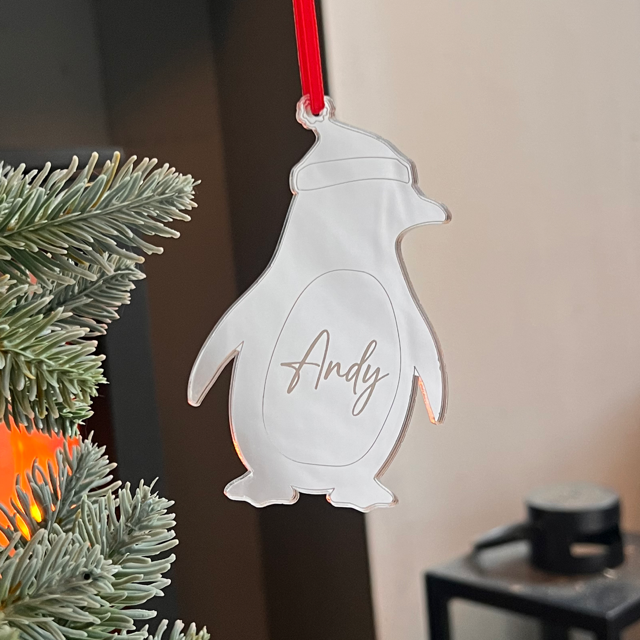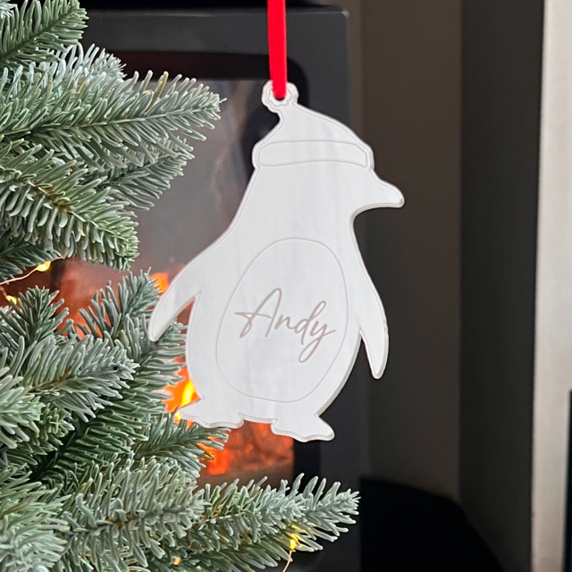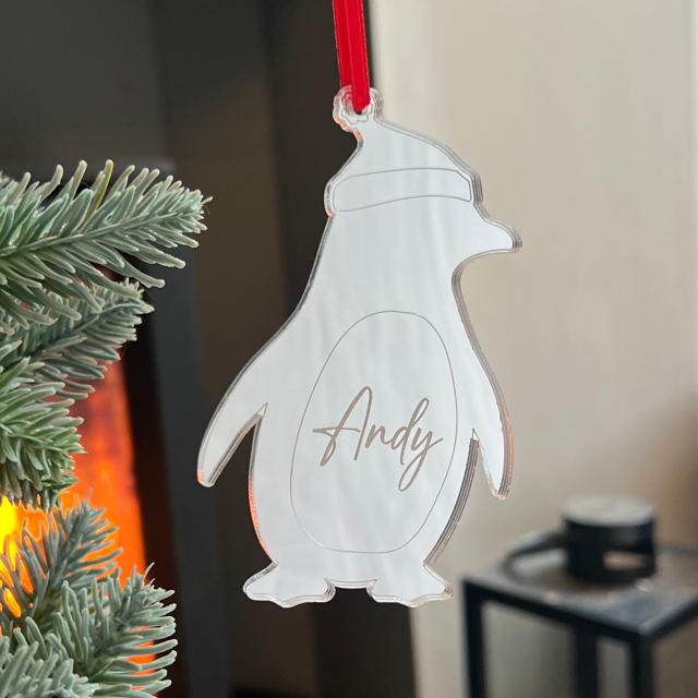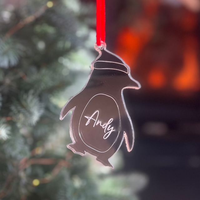 Celebrate Christmas with this adorable penguin decoration, available in mirror gold, silver or rose gold acrylic. Each penguin features your chosen name beautifully engraved, making it a special keepsake for children, families, or anyone who loves festive fun.