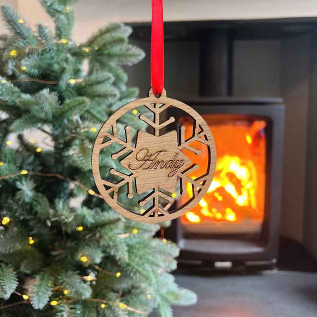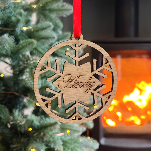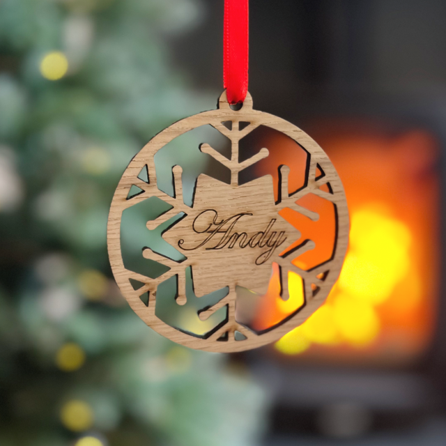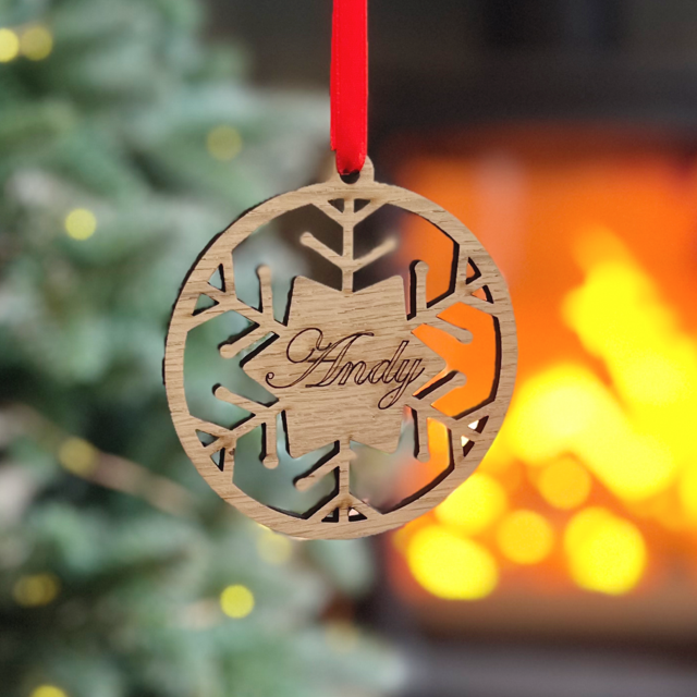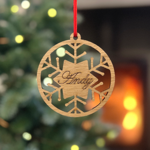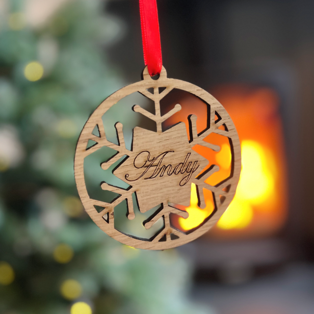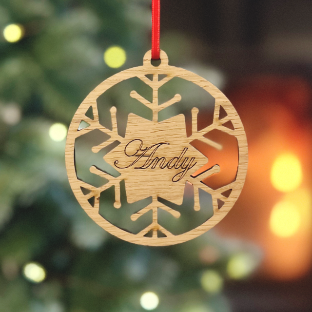Add a touch of personal magic to your Christmas tree with our engraved wooden snowflake decoration. Made from high-quality MDF veneer wood, this beautiful ornament is laser cut with a snowflake design and personalised with any name of your choice.