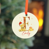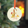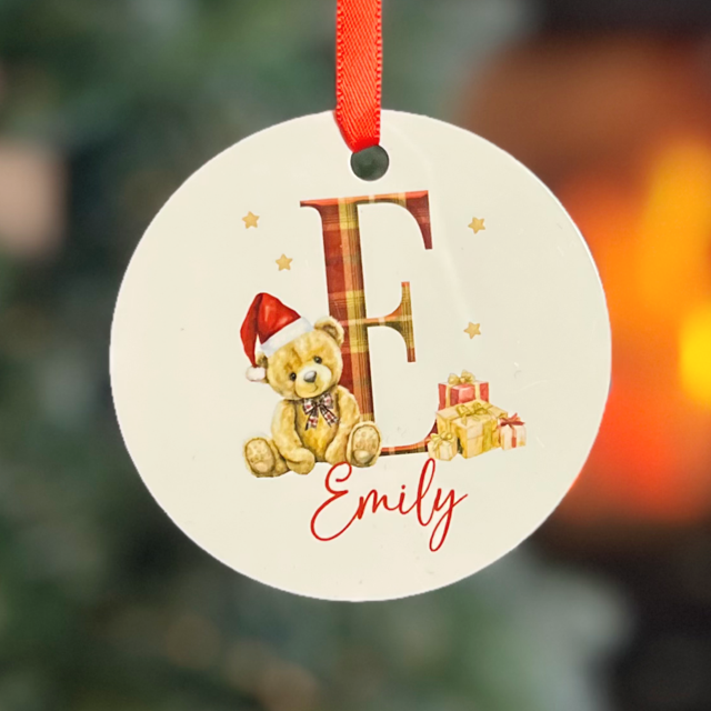 Each bauble features a large tartan-style initial and a sweet festive teddy design, complete with a Santa hat and little presents — the perfect keepsake for little ones or anyone who loves a classic Christmas look.