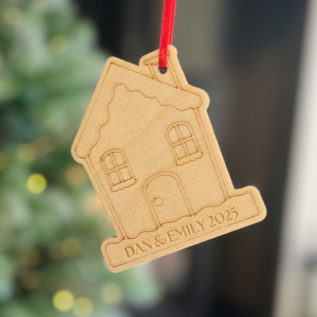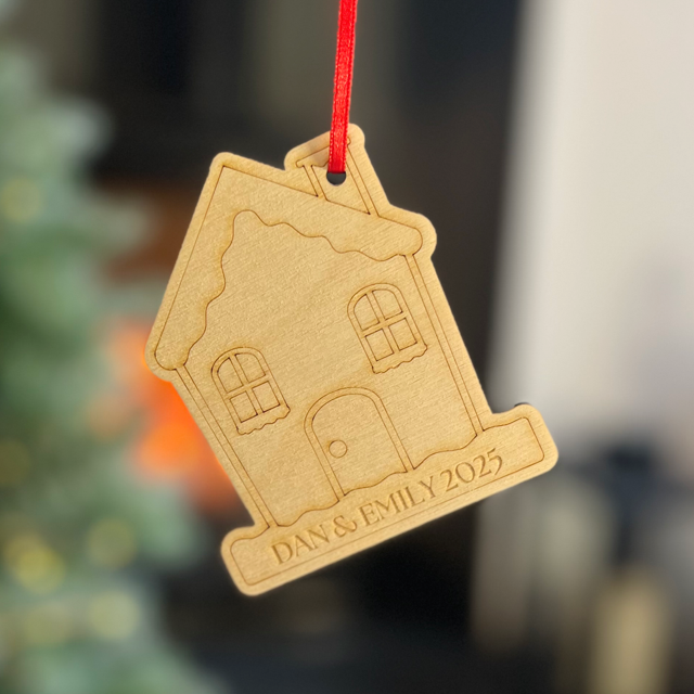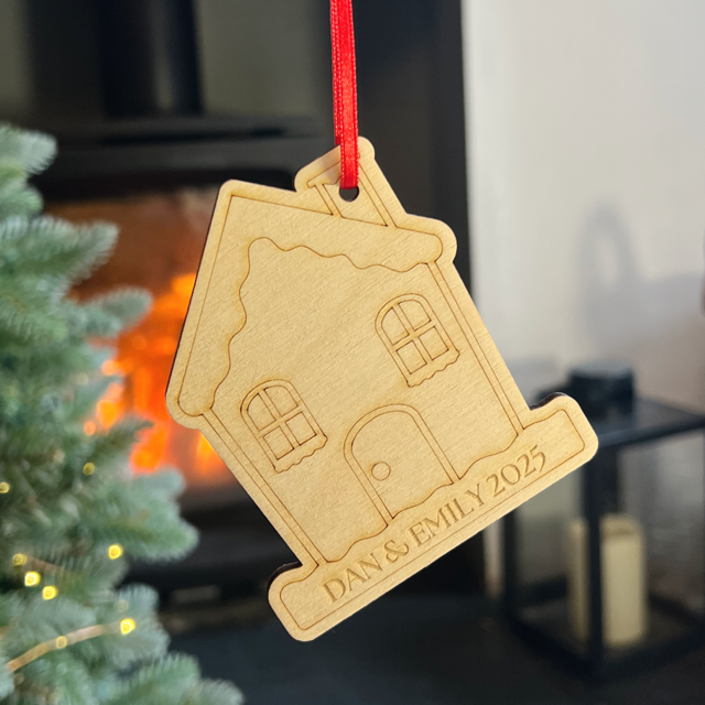 Wooden House Christmas Decoration – Engraved with Names & Year
