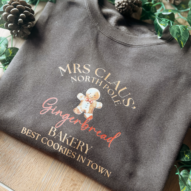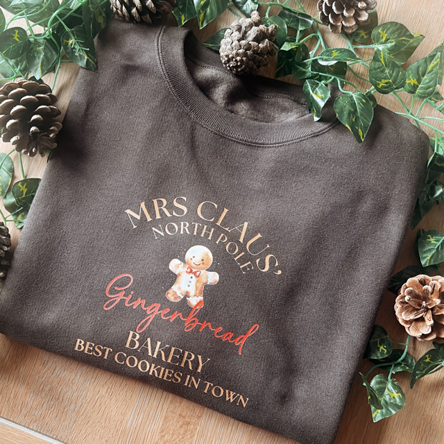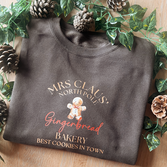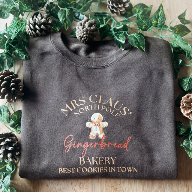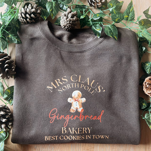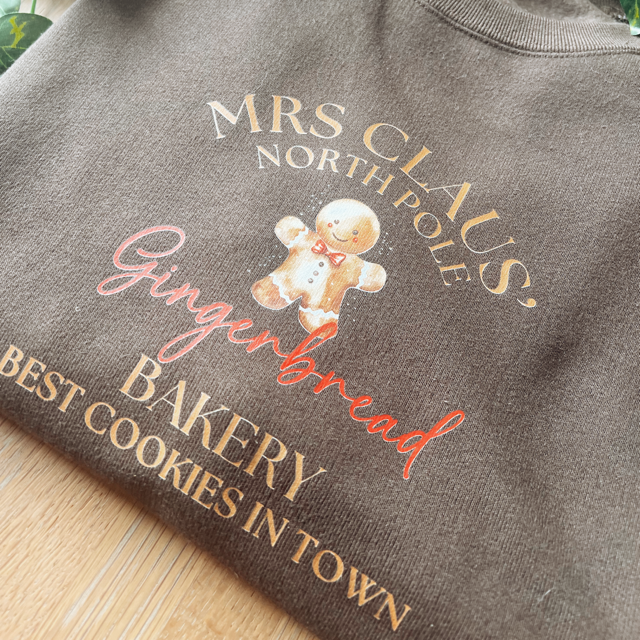 Experience the warmth and comfort of Mrs. Claus' bakery with this cosy Gingerbread Bakery Sweatshirt. Perfect for lounging on those cold winter nights, this stylish sweatshirt pairs well with hot cocoa and a good book. You won't want to take it off!