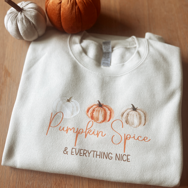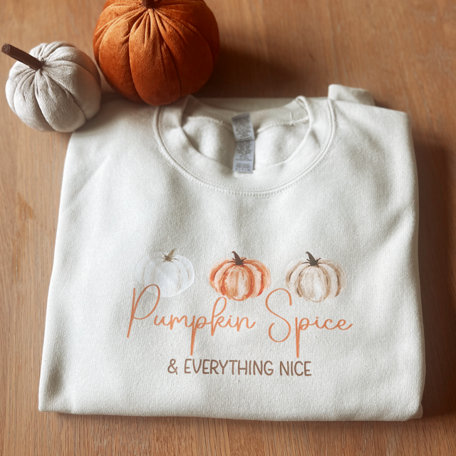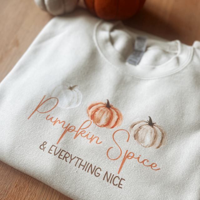 This Pumpkin Spice & Everything Nice Sweatshirt is the perfect way to look great and stay cosy this season! Perfect for the chilly autumn days, this sweatshirt is sure to keep you feeling comfortable and stylish. Feel the warmth of autumn with this timeless piece.