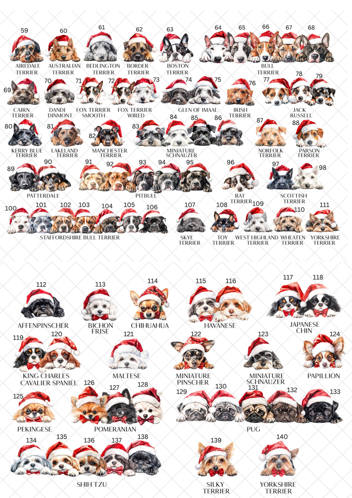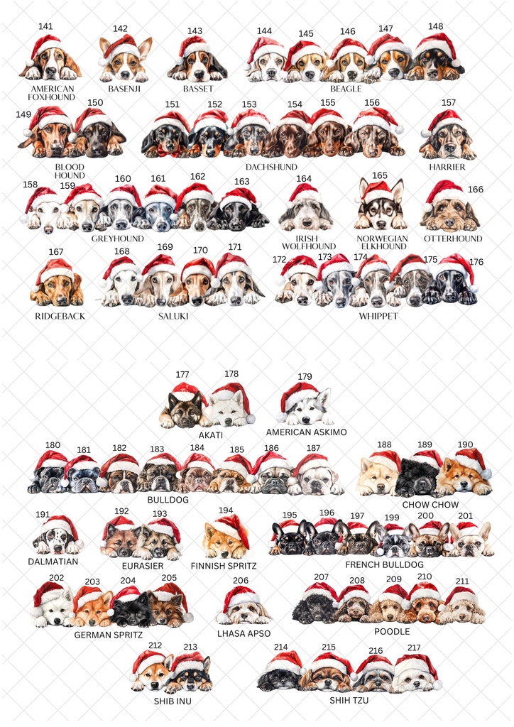✨ Choice of over 217 adorable dog breed illustrations, each wearing a Santa hat