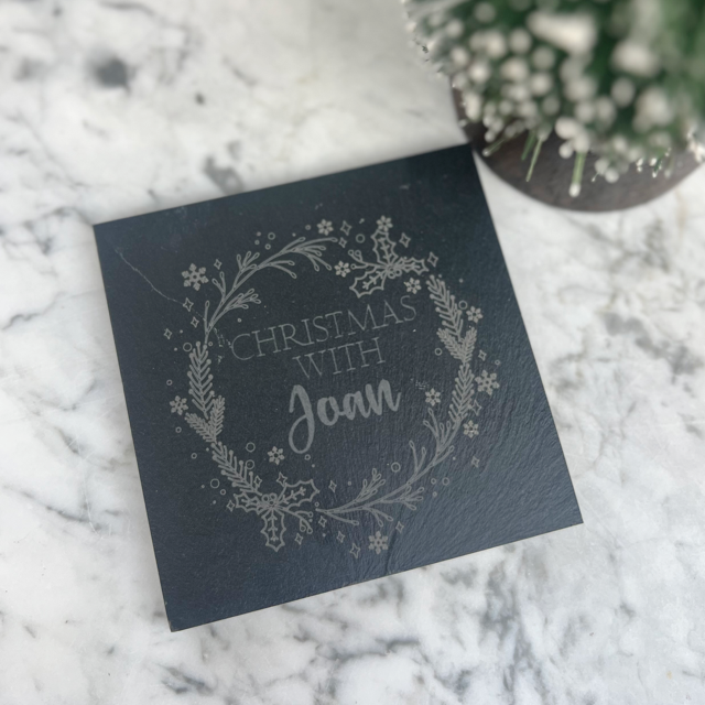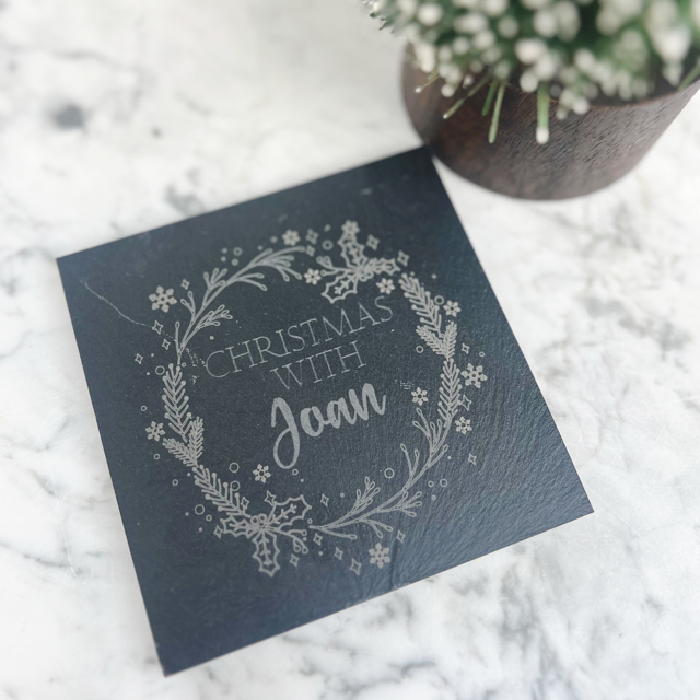 Bring a gorgeous personal touch to your festive table with this Personalised Christmas Slate Coaster. Each coaster features the wording “Christmas With” as standard, surrounded by a delicate festive wreath — simply add your chosen name to complete the design.