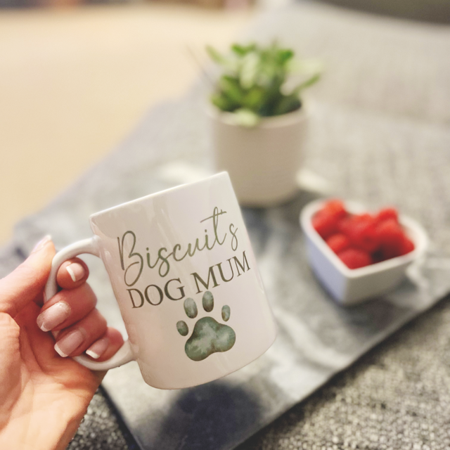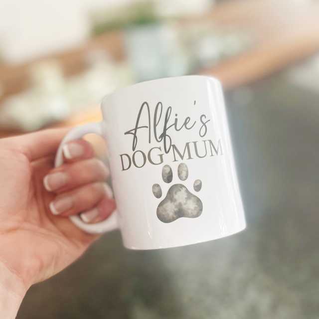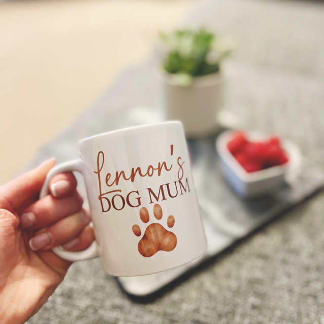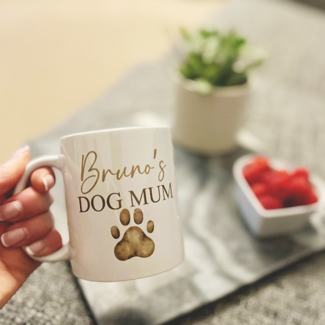 This custom-made Dog Mum mug is more than just a cup - it's a heartfelt reminder of the times you've spent with your furkid. Enjoy a special cup of coffee or tea with this mug that proudly celebrates your special bond. Perfect for the proud doggy mom in your life!