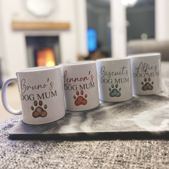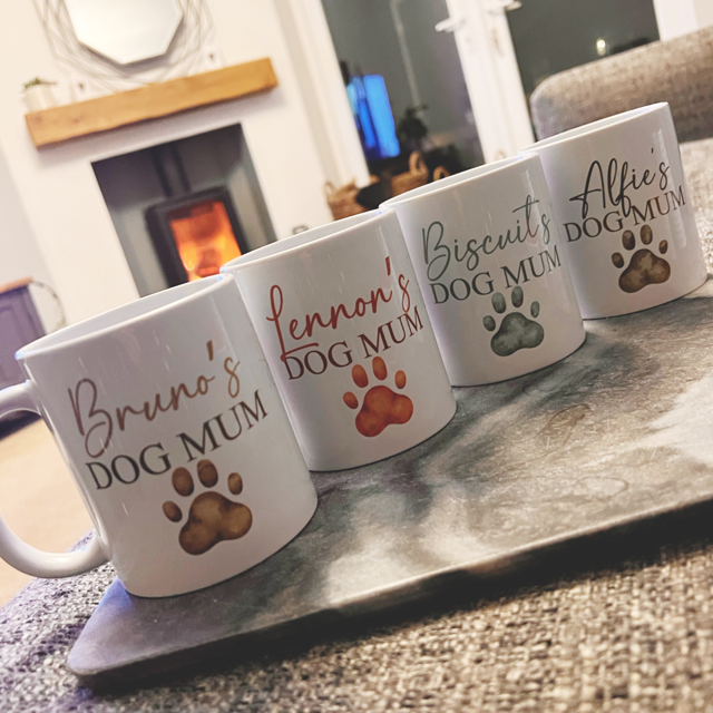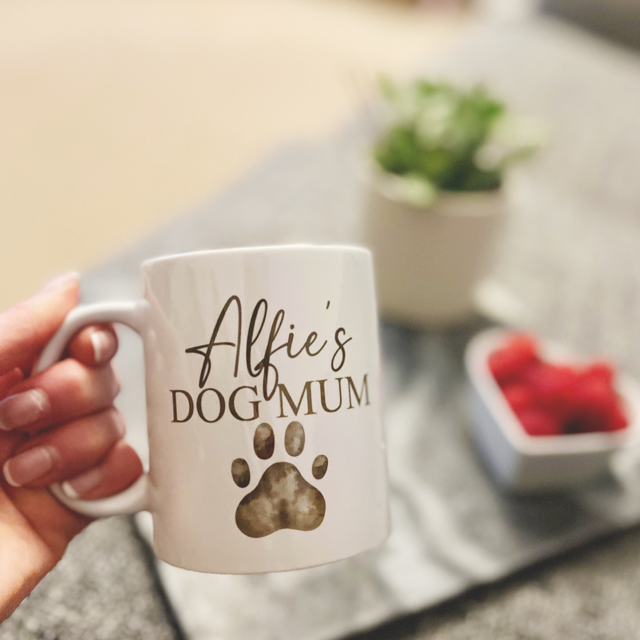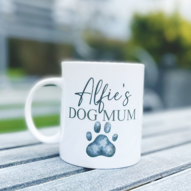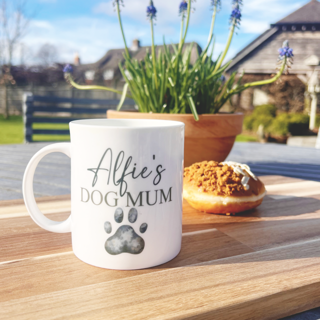 PERSONALISED INFO: MAX 18 Spaces (Alfie's) DOG MUM is standard, Please select one of the paw colours. Text colours will match the paws. The photo is paw 2. All mugs are made to order as may differ slightly, This includes text size.