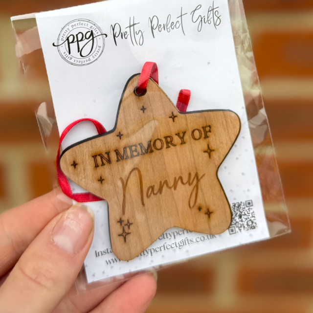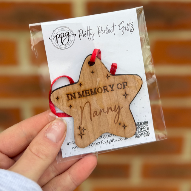This small wooden star decoration is engraved with In Memory Of nanny — a simple and beautiful keepsake to hang on your tree year after year.