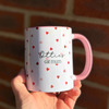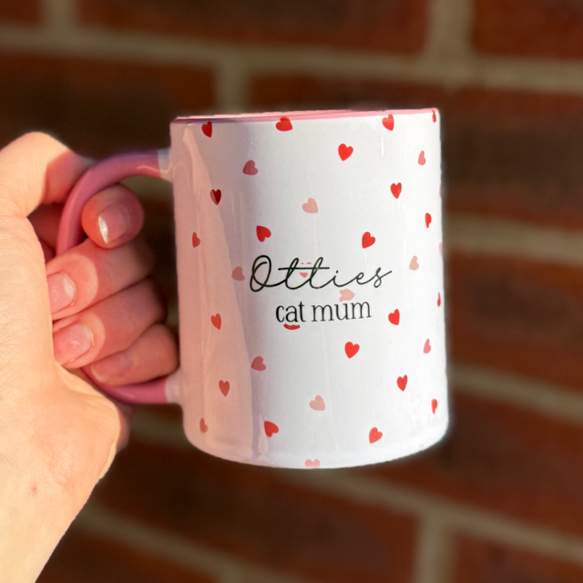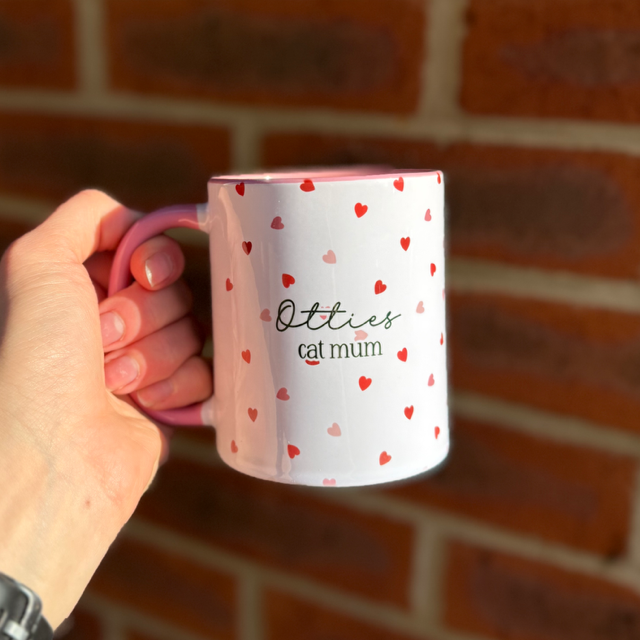A sweet personalised mug for every proud cat mum. Add any name to the top line and we’ll print it above the fixed wording “cat mum” on a cute pink heart-pattern mug — perfect for birthdays, Christmas, or a cosy cuppa with your feline bestie.