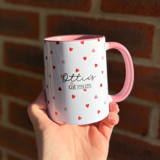 A lovely gift for any cat mum. Your chosen name is printed above the fixed wording cat mum on a cute heart-covered mug.